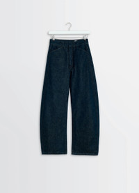 These high-waisted pants with their rounded cut are an emblematic piece of the Lemaire wardrobe. They are made from thick denim, a Lemaire wardrobe staple, in a deep indigo wash. The model is 177 cm and is wearing a size 36 (S). DETAILS High waisted pants in heavy indigo denim Curved cut Belt loops at the waistband Closure with hooks, buttons, and hidden zipper Western pockets with a ticket pocket Back patch pockets Lemaire embossed leather jacron at the back Contrast topstitching Made in Italy Style : PA1264 LD1056 CARE Main Material: 100% Cotton Main Lining: 65% Polyester 35% Cotton Jacron: 100% Cow Leather Soft wash 30° Do not bleach Do not tumble dry Cool ironing Soft dry clean Wash upside down