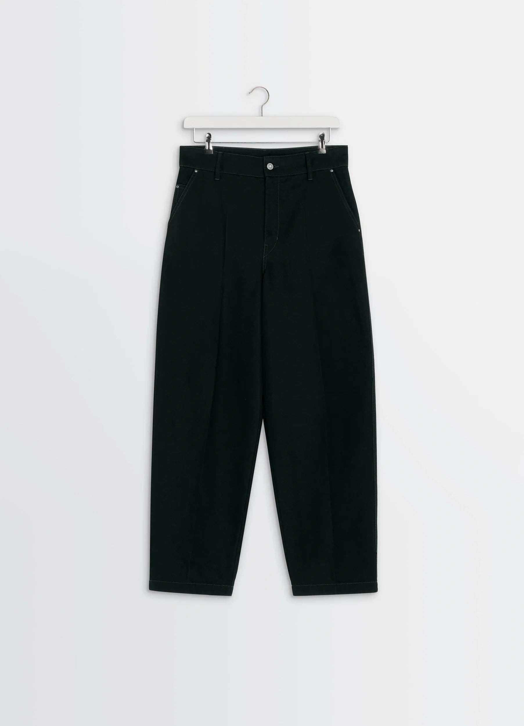 These oversized barrel-cut pants reflect Lemaire's love for workwear and reinterpretation of archetypal pieces. They are crafted in thick denim, a signature material of the house, in a deep black wash. DETAILS Barrel workwear pants in heavy black denim Oversized cut Belt loops at the waistband Button closure with hidden zipper Silver-plated metal buttons Distinct front and black pleats Italian side pockets Ticket pocket Back patch pockets Copper-toned metal rivets Lemaire embossed leather jacron at the back Contrast topstitching Made in Morocco Style : PA1261 LD1055 The model is 187 cm tall and is wearing a size 48 (M). FABRICS & CARE Main Material: 100% Cotton Main Lining: 100% Cotton Jacron: 100% Cow Leather