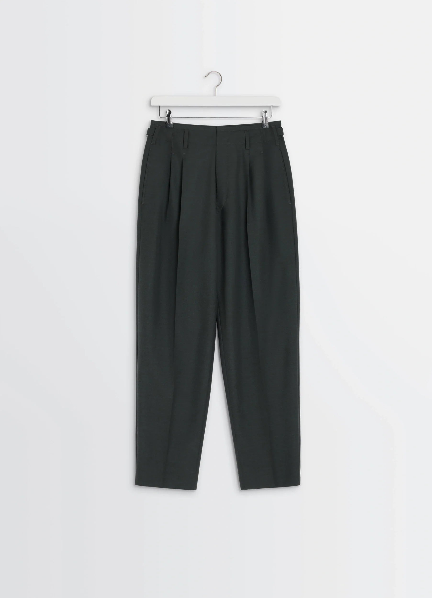 These pleated pants are made from a tropical wool-blend suiting fabric characterized by its mottled look and dense, supple hand. Inspired by Lemaire's taste for the link between comfort and elegance, this piece is fitted with metal buckle tabs. DETAILS Pleated pants in tropical wool blend Relaxed cut Tone-on-tone waistband and bias trim Hook and button closure Matching belt loops Front pleats Side pockets Adjustable side tabs with metal buckles Welted back pockets, including one with a button flap Made in Slovakia Style : PA1169 LF414 The model is 187 cm tall and is wearing a size 48 (M). FABRICS & CARE Main Material: 55% Polyester 45% Wool Main Lining: 100% Cotton