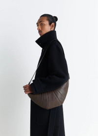 The Croissant line is emblematic of the Lemaire wardrobe. This supple, versatile bag features a curve inspired by the Viennoiserie of the same name, created by an assembly of topstitched panels. It is reinterpreted here with a shoulder strap in smooth, embossed leather with a rail motif. This medium bag is crafted in LWG Gold-certified grained leather, a thick, resistant material characterized by its textured look. DETAILS Medium Rail Belt Croissant bag in grained leather Hand, shoulder, and crossbody carry Soft model with stitched panels Rail motif embossed smooth leather strap Removable with collar studs, loops, and rings Knotted detailing on sides Zipper closure with quilted pull tab Cotton canvas lining and inside card pocket Lemaire embossed interior leather label Silver-plated metalwork Dimensions: Length: 44 cm Height: 24 cm Depth: 9 cm Arrow height: 42 cm Strap length: 84 cm Made in Spain Style : BG0171 LL0137 FABRICS & CARE Main Material: 100% Cow Second Material: 100% Cow Main lining: 100% Cotton