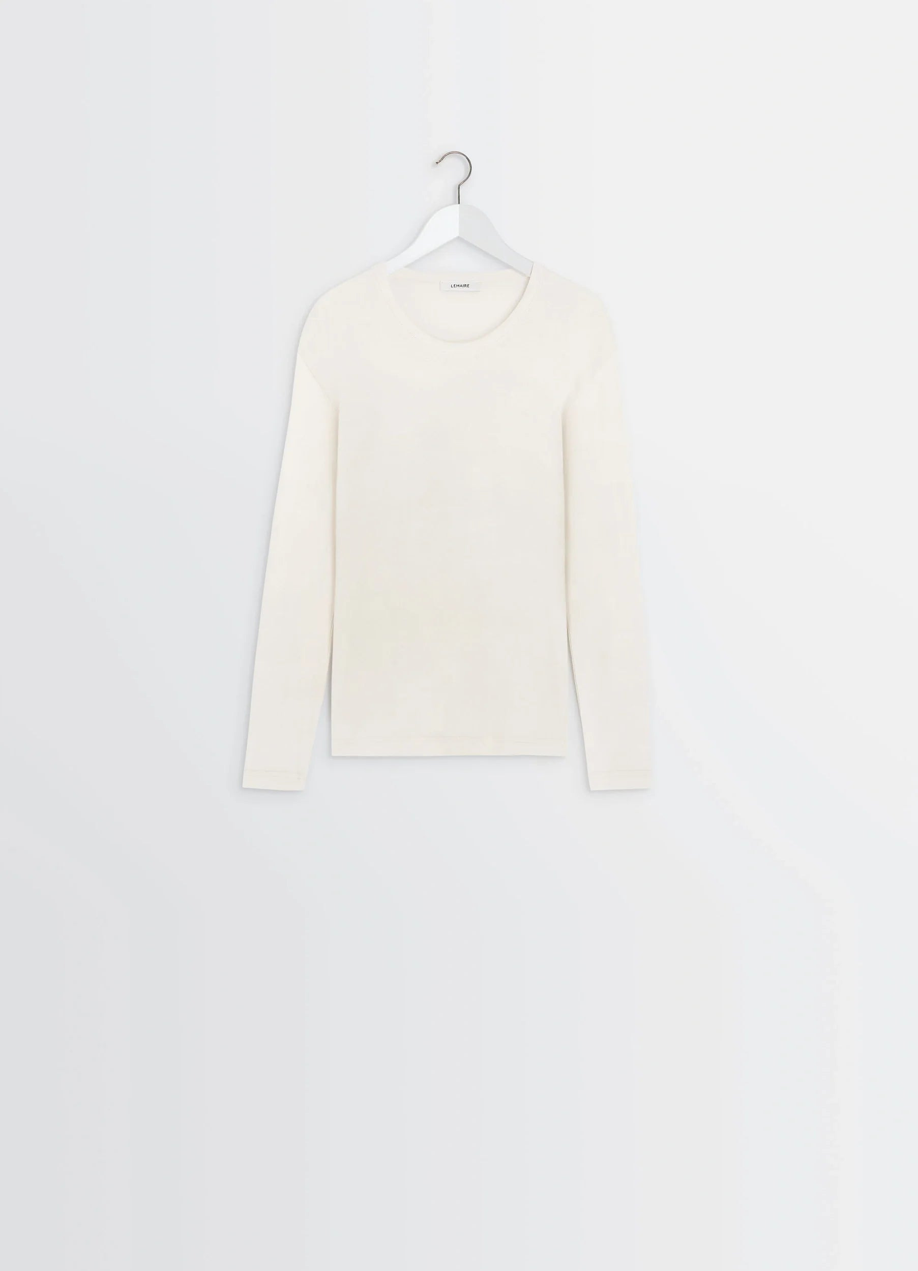 This long-sleeved t-shirt is a classic piece in the Lemaire wardrobe. It is crafted in flowing cotton jersey, knitted with supple, textured ribbing. DETAILS Long sleeve top in ribbed jersey Straight cut Ribbed crewneck Made in Portugal Style : TO1441 LJ1016 The model is 177 cm tall and is wearing a size 36 (S). FABRICS & CARE Main Material: 100% Cotton