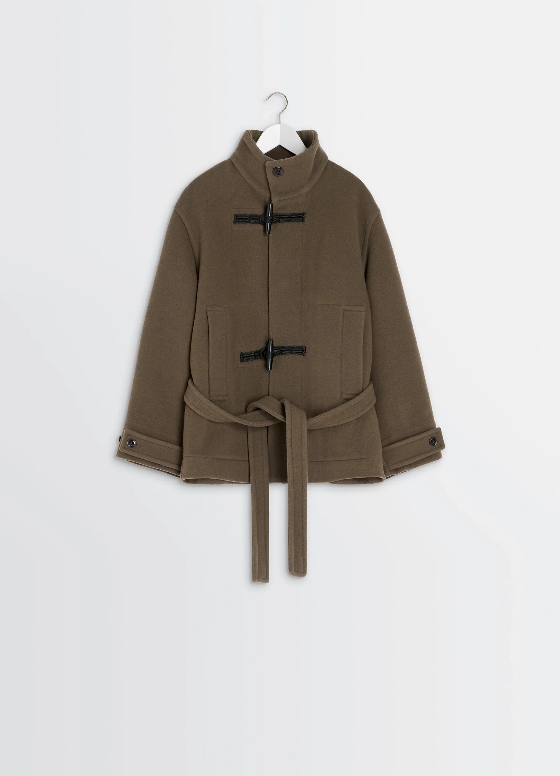 This duffle coat is an archetypal piece reinterpreted by Lemaire with shiny piping and utilitarian metallic details. Crafted in double-faced wool, it offers a soft, warm wear. This piece is an ideal combination of sophistication and functionality. The model is 177 cm tall and is wearing a size 36 (S). This duffle coat is an archetypal piece reinterpreted by Lemaire with shiny piping and utilitarian metallic details. Crafted in double-faced wool, it offers a soft, warm wear. This piece is an ideal combination of sophistication and functionality. The model is 177 cm tall and is wearing a size 36 (S). DETAILS Short double-faced wool duffle coat Oversized cut Unlined model Buttoned stand-up collar Long sleeves finished off with buttoned tabs Closure with snaps and satin frog fasteners Side pockets Belt loops at the back Removable belt Inside patch pocket with buttoned closure Interior tab for hand carry Interior herringbone ribbon trim Made in Lithuania Style : CO1113 LF1116 Short double-faced wool duffle coat Oversized cut Unlined model Buttoned stand-up collar Long sleeves finished off with buttoned tabs Closure with snaps and satin frog fasteners Side pockets Belt loops at the back Removable belt Inside patch pocket with buttoned closure Interior tab for hand carry Interior herringbone ribbon trim Made in Lithuania Style : CO1113 LF1116 CARE Main Material: 100% Wool Main Lining: 100% Cotton Main Material: 100% Wool Main Lining: 100% Cotton