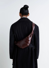 This classic LEMAIRE bag is part of the iconic Croissant family. The Small Croissant is made from coated cotton with a crisp texture and a shiny finish, which was granted a GOT Certification. Its distinctive surface adds a tactile element and contributes to its durability. Inspired by the shape of the eponymous pastry, this vegan bag is achieved through an assembly of top-stitched cutouts, blending style and functionality. It features a matching looped zip puller and side knot finishings. It will host small accessories such as a smartphone, a card holder and a wallet, and can be worn over the shoulder or cross-body. DETAILS - This bag can be worn on the shoulder or cross-body - Height of the shoulder strap: 43cm / 17in - Length: 35cm / 14in - Width: 16cm / 6in - Depth: 5cm / 2in - Lining in cotton canvas - Metal Looped zip puller - Small interior patch pocket (can contain cards, small keys or a public transportation pass) - Main compartment (can contain smartphone, card holder, Airpods Pro 2 case and wallet) - Side knot finishings - Embossed logo inside Made in Tunisia Style: BG0003 LF1329 FABRICS & CARE Main Fabric: 100% Cotton Main Lining: 100% Cotton Do not wash Do not bleach Do not tumble dry Do not iron Professional cleaner only