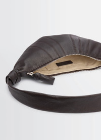 This classic LEMAIRE bag, the smallest of the Croissant Bag family, is made of soft grained leather that is supple yet resistant. Inspired by the shape of a croissant pastry, the bag's design is achieved through an assembly of topstitched cutouts. It features a matching looped zip puller, and side knot finishings, and is worn as a shoulder or crossbody bag. __TAB__ Cotton canvas liningMetal zip Interior patch pocket Length 16 cm Width 35 cm Depth 5 cm Made in SpainStyle : BG0003 LL0018 __TAB__ Main Material: 100% Cowhide Leather Main Lining: 100% CottonDo not washDo not bleachDo not tumble dryDo not ironProfessional leather clean only