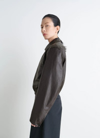 This cropped leather jacket completes Lemaire's feminine wardrobe. It is made from soft cow leather, a lightweight material with a paper-like appearance and natural shine. The model is 177 cm tall and is wearing a size 36 (S). This cropped leather jacket completes Lemaire's feminine wardrobe. It is made from soft cow leather, a lightweight material with a paper-like appearance and natural shine. The model is 177 cm tall and is wearing a size 36 (S). DETAILS Soft leather blouson Straight cut, cinched at the waist .Fully lined model Shirt collar Button closure Long sleeves Straight buttoned cuffs Welted chest pocket Elasticated waistband Inside patch pocket Made in Turkey Style : OW1158 LL0146 Soft leather blouson Straight cut, cinched at the waist .Fully lined model Shirt collar Button closure Long sleeves Straight buttoned cuffs Welted chest pocket Elasticated waistband Inside patch pocket Made in Turkey Style : OW1158 LL0146 CARE Main Material: 100% Cow Leather Main Lining: 51% Cotton 49% Viscose Second Lining: 100% Cotton Do not wash Do not bleach Do not tumble dry Do not iron Professional leather clean only Main Material: 100% Cow Leather Main Lining: 51% Cotton 49% Viscose Second Lining: 100% Cotton Do not wash Do not bleach Do not tumble dry Do not iron Professional leather clean only