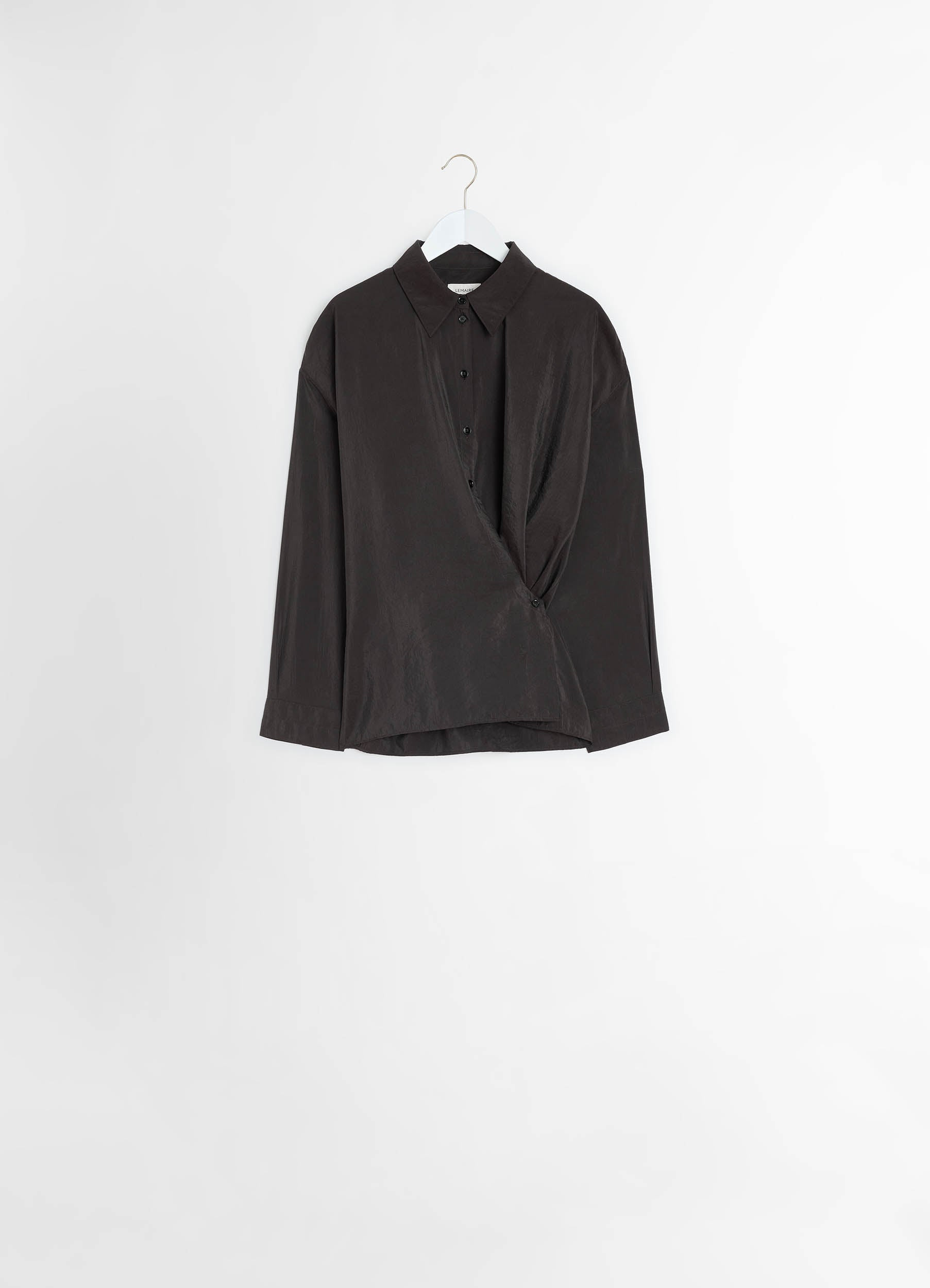 This shirt is part of the iconic Twisted family and a staple of LEMAIRE’s wardrobe. It is made of dry silk, a classic LEMAIRE fabric with a soft hand and tonic texture. Its details include a straight collar and an asymmetric button placket that closes over the hip, wrapping around the waist. DETAILS - Relaxed fit - Straight collar - Corozo buttons - Adjustable angled cuffs - Knotted inner tie Made in Romania Style: SH1141 LF1308 FABRICS & CARE Main Material: 76% Silk, 24% Nylon Soft wash 30° Do not bleach Do not tumble dry Cool ironing Soft dry clean