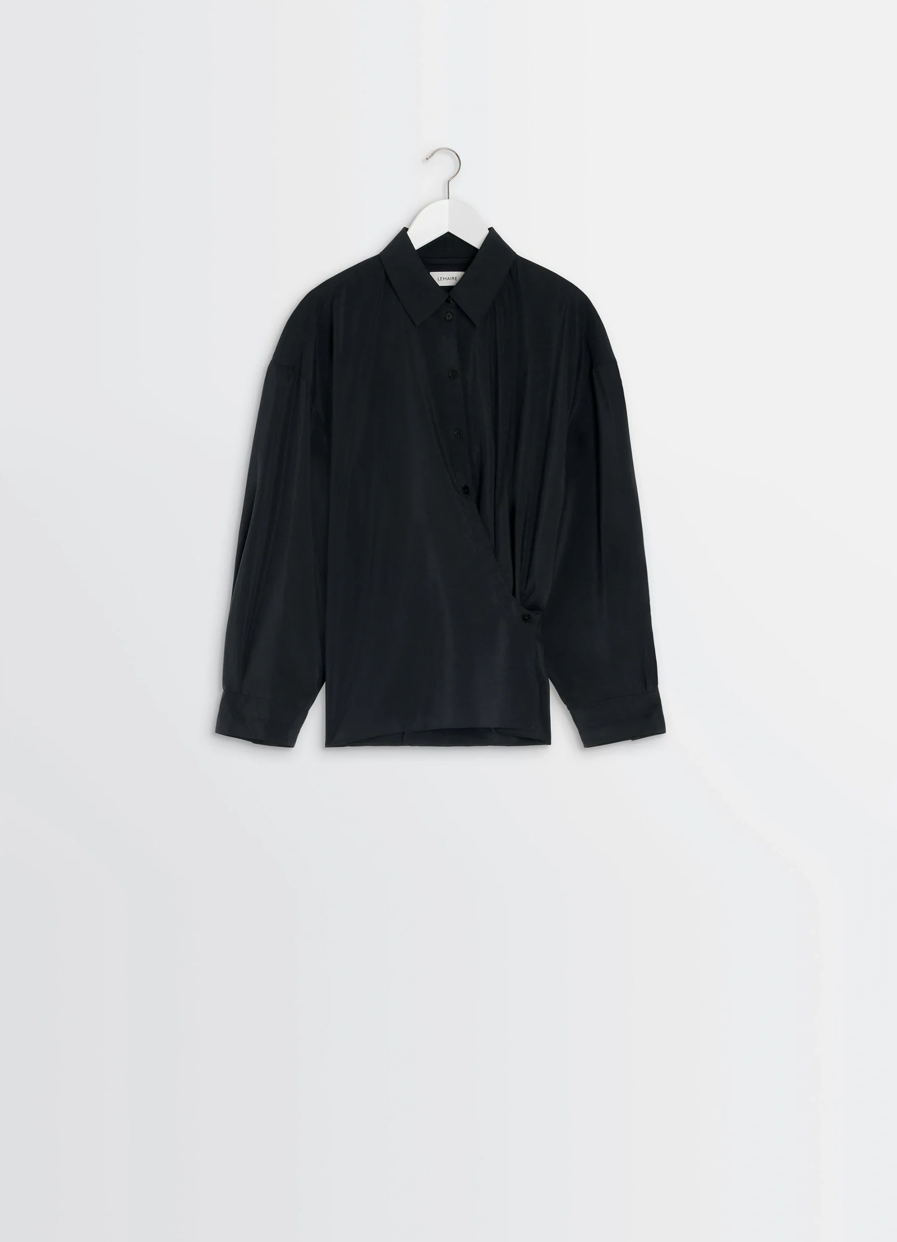 This shirt is part of the Twisted family emblematic of the Lemaire wardrobe. It is crafted in a dry silk blend, a classic house fabric with a soft hand and slightly crinkled texture. DETAILS Twisted shirt in a dry silk blend Straight cut Shirt collar Long sleeves Straight buttoned cuffs Buttoned asymmetrical closure Interior closure with wrap-style tie Gathers at the back Made in Romania Style : SH1141 LF1308 The model is 177 cm and is wearing a size 36 (S). FABRICS & CARE Main Material: 76% Silk 24% Polyamide