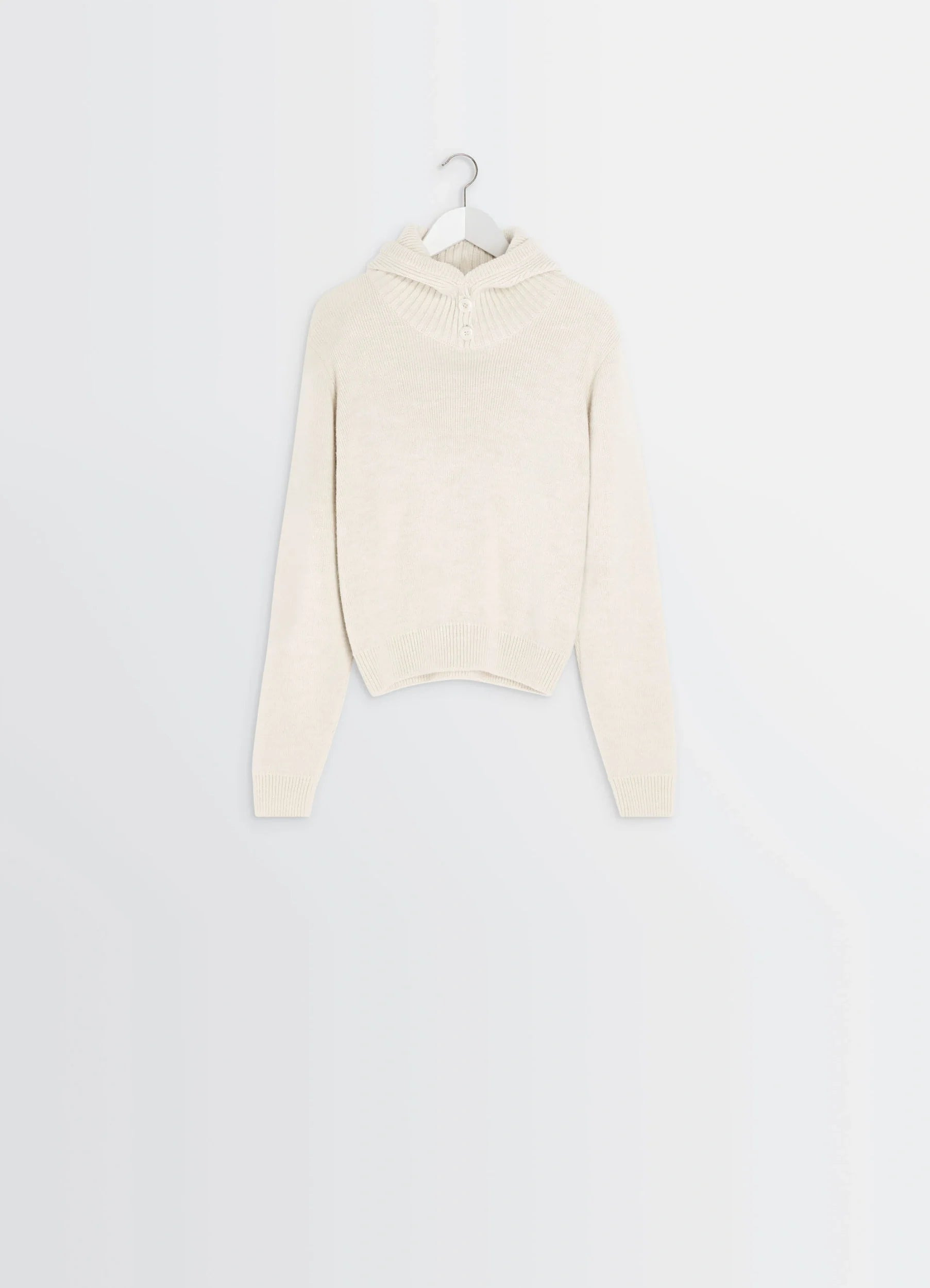 Inspired by Lemaire's taste for the link between comfort and elegance, this button-down hooded sweater is crafted from a blend of wool and alpaca, a knit that is soft and warm to the touch. The model is 177 cm and is wearing a size 36 (S). DETAILS Hooded sweater in alpaca wool blend Straight cut Front-buttoned ribbed knit hood Long sleeves Rib-knit trim Made in Portugal Style : TO1410 LK1028 CARE Main Material: 45% Acrylic 40% Alpaca 15% Wool Hand wash Do not bleach Do not tumble dry Cool ironing Soft dry clean Dry flat