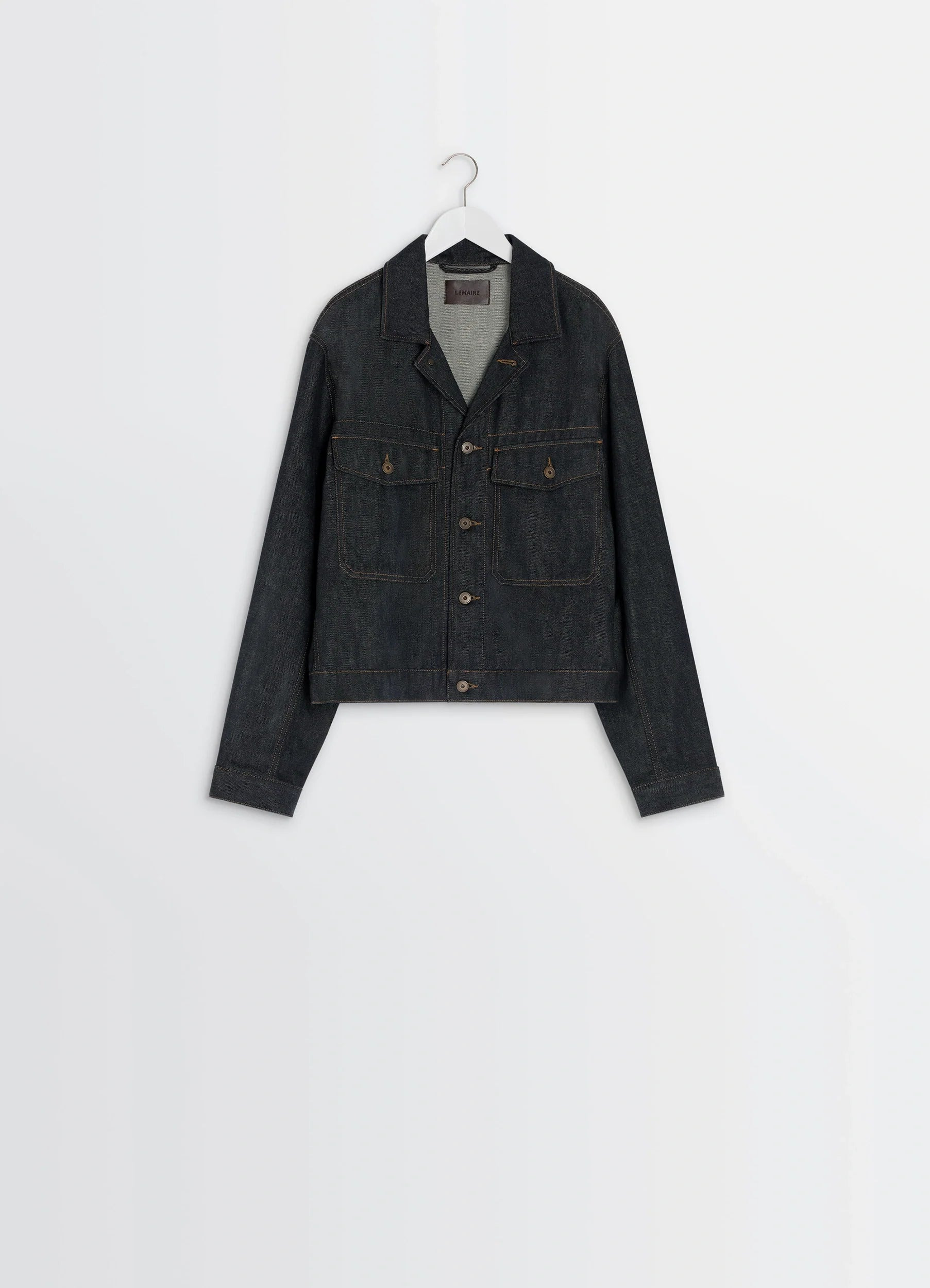 This trucker jacket is an emblematic piece in Lemaire's workwear wardrobe. It is crafted in thick, yarn-dyed slate denim with a raw hand, adding a sophisticated touch to the silhouette. DETAILS Trucker jacket in yarn-dyed heavy slate denim Straight cut Shirt collar Front button closure Long sleeves Straight buttoned cuffs Chest patch pockets with button flaps Adjustable tabs at the waistband Metal buttons with ornamental trim Contrast topstitching Interior Lemaire embossed leather label Made in Italy Style : OW1188 LD1061 The model is 187 cm tall and is wearing a size 48 (M). FABRICS & CARE Main Material: 100% Cotton Jacron: 100% Cow Leather