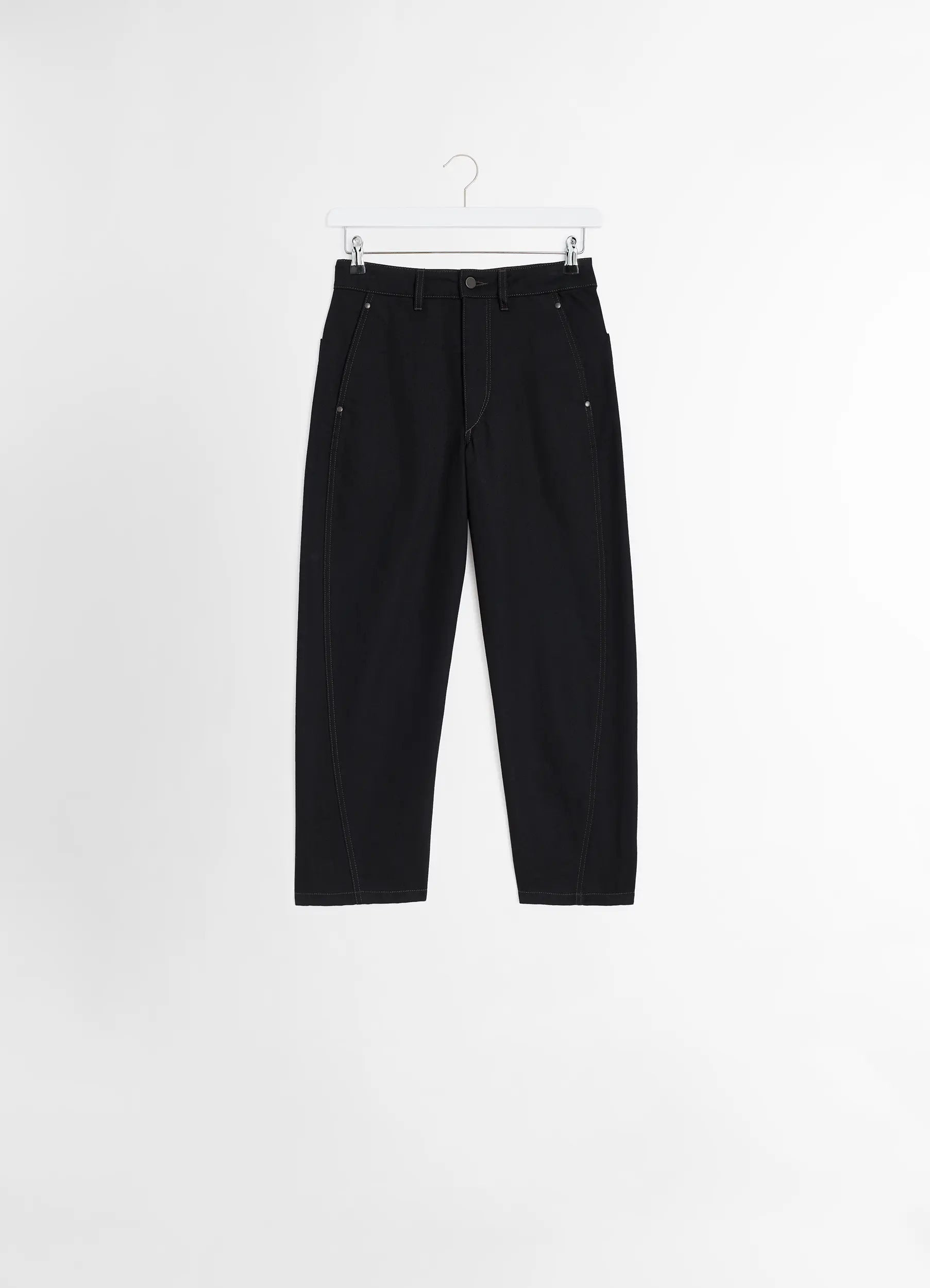 These pants are made of a heavy denim with a visible twill weave and a deep black wash. The key features of these classic LEMAIRE pants include four pockets and twisted side seams, giving a slightly curved volume to the leg. Their cut is straight and finished with workwear details. DETAILS Straight fit Contrast stitching High-rise Metal button Studs and zipper Side-seam pockets Two back patch pockets Made in Morocco Style : PA1051 LD1000 This model is 177 cm and is wearing a size 36/S FABRICS & CARE Main Fabric : 100% Coton Soft wash 30° Do not bleach Do not tumble dry Cool ironing Soft dry clean Wash upside down