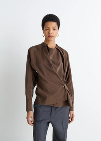 This long-sleeved top is part of the Twisted family emblematic of the Lemaire wardrobe. It is crafted in a dry silk blend, a classic house fabric with a soft hand and slightly crinkled texture. DETAILS Twisted top in dry silk Casual flowing cut Crewneck with side pleats Long raglan sleeves Straight buttoned cuffs Front pleat with buttonhole Lacquered buton on the side Made in Romania Style : TO1081 LF1308 The model is 177 cm and is wearing a size 36 (S). FABRICS & CARE Main Material: 76% Silk 24% Polyamide
