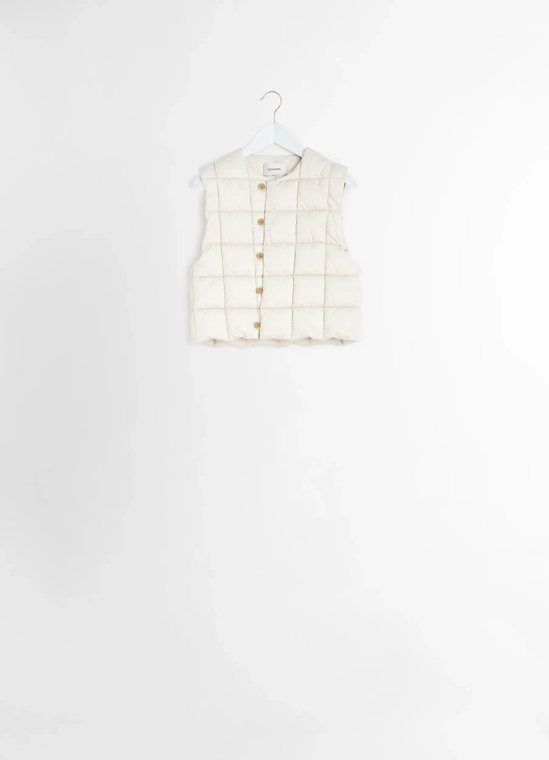 This is a new interpretation of a LEMAIRE classic. The Wadded Gilet is crafted in light cotton satin, offering a soft touch and fluid texture with a subtle sheen. It fastens via a series of corozo buttons to close with straps, all the way up to the wadded stand collar, and the placket is reinforced by a contrast topstitching detailing. It features two wadded patch pockets on the sides and a patch pocket inside. A comforting piece to wear on its own or layered, this gilet has generous armholes and is fully lined in the same soft material as its outside shell. DETAILS - Relaxed fit - Wadded stand collar - Corozo buttons - Patch pockets - Inside pocket - Fully lined Made in Romania Style: OW1032 LF1207 The Model is 180cm / 5' 11" ft and is wearing a size 36 (S). FABRICS & CARE Main Fabric: 100% Cotton Main Lining: 100% Cotton Trims: 100% Polyester Do not wash Do not bleach Do not tumble dry Do not iron Soft dry clean Discover the traceability