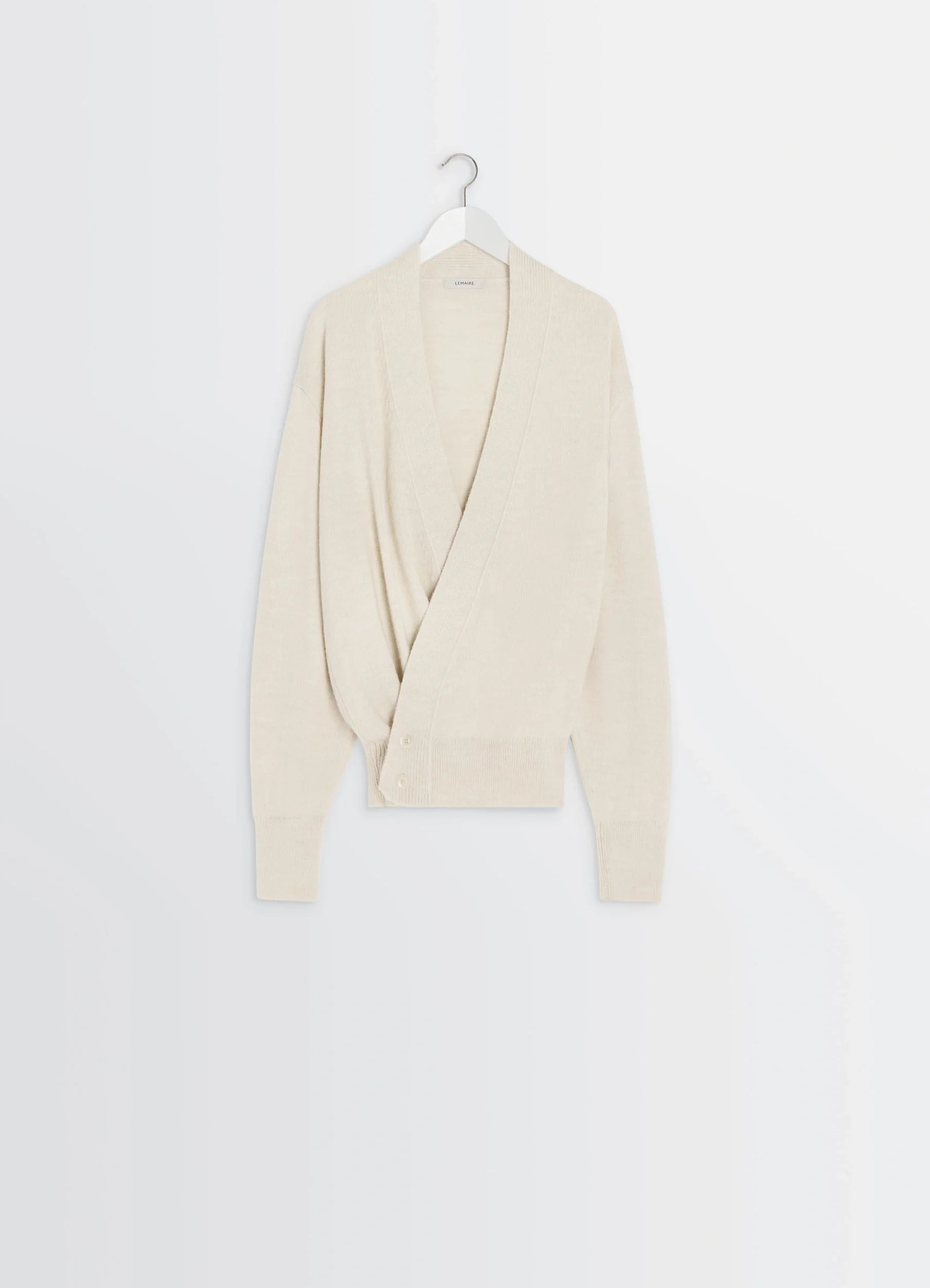 Inspired by Lemaire's taste for the link between comfort and elegance, this wrap-around, double-breasted cardigan is crafted from a blend of wool and alpaca, a knit that is soft and warm to the touch. DETAILS Wrap cardigan in alpaca wool blend V-neck Long sleeves Wrap button closure Tone-on-tone lacquered buttons Rib-knit trim Made in Portugal Style : TO1476 LK1028 The model is 187 cm tall and is wearing a size 48 (M). FABRICS & CARE Main Material: 45% Acrylic 40% Alpaca 15% Wool