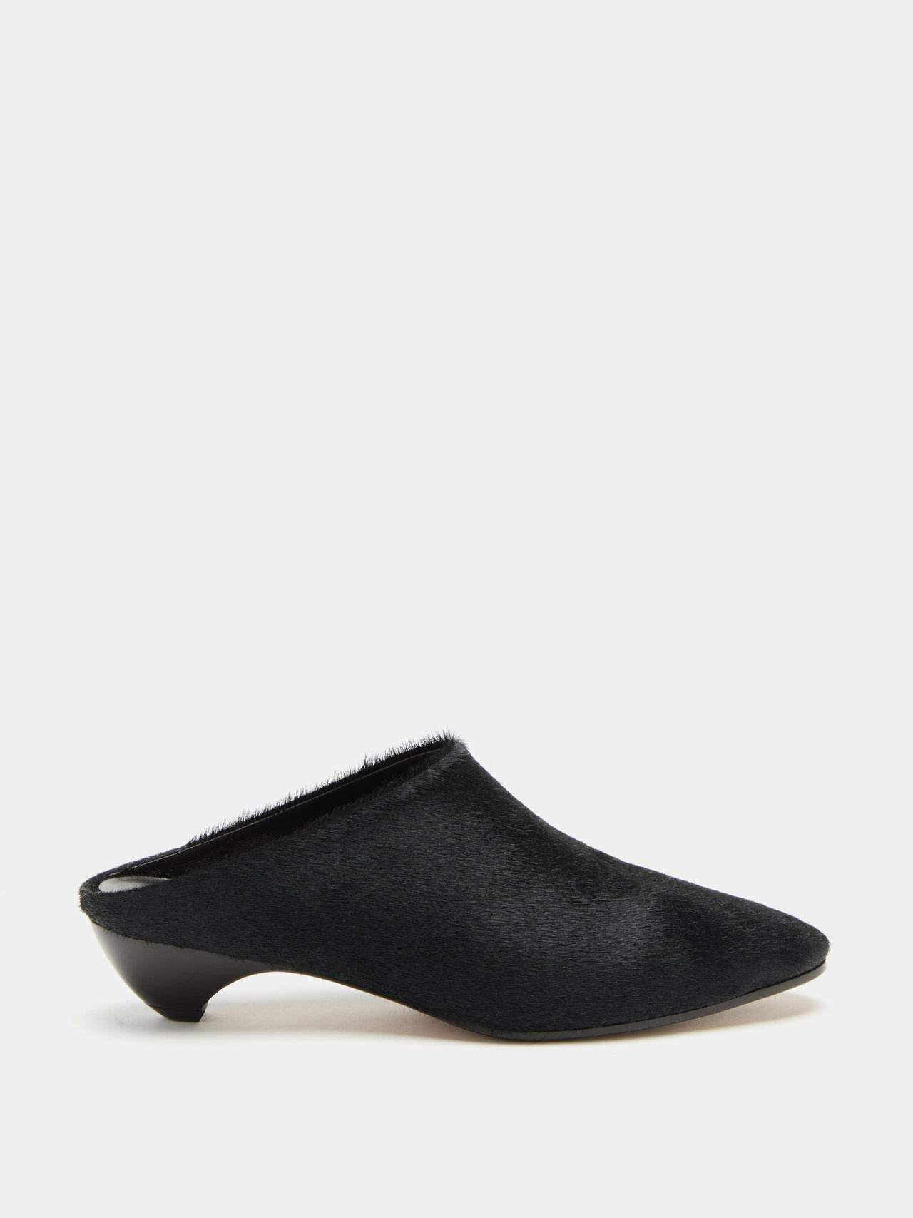 Allegra Mule, handcrafted in black calf hair, with a cushioned calf leather insole and a 35mm heel. Slip on. Made in Italy.