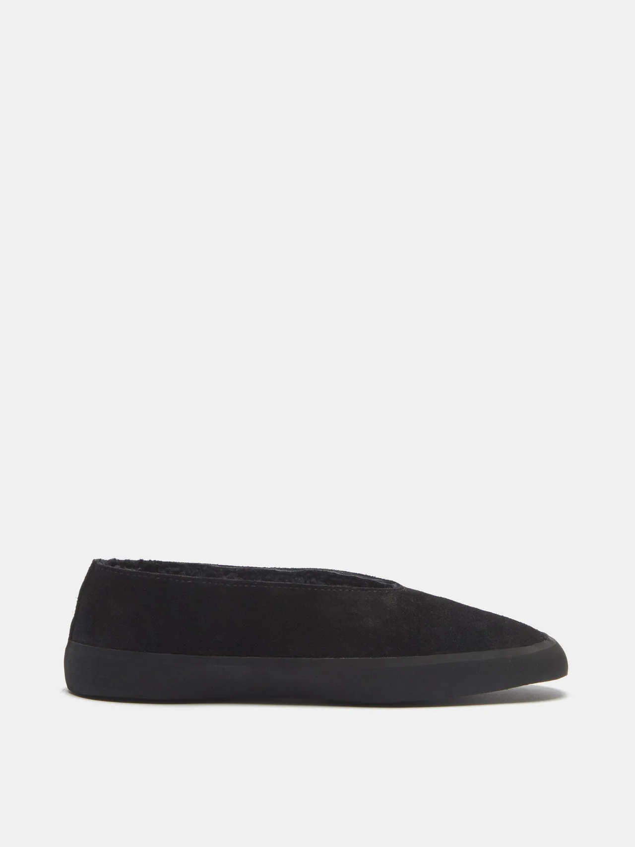 Black Suede Apres Ski Shearling Flats. Cushioned insole with tonal shearling lining, tread in smooth rubber. 8mm heel. Made in Italy. This style fits small, try a size larger than your usual size. Black Suede Apres Ski Shearling Flats. Cushioned insole with tonal shearling lining, tread in smooth rubber. 8mm heel. Made in Italy. This style fits small, try a size larger than your usual size.