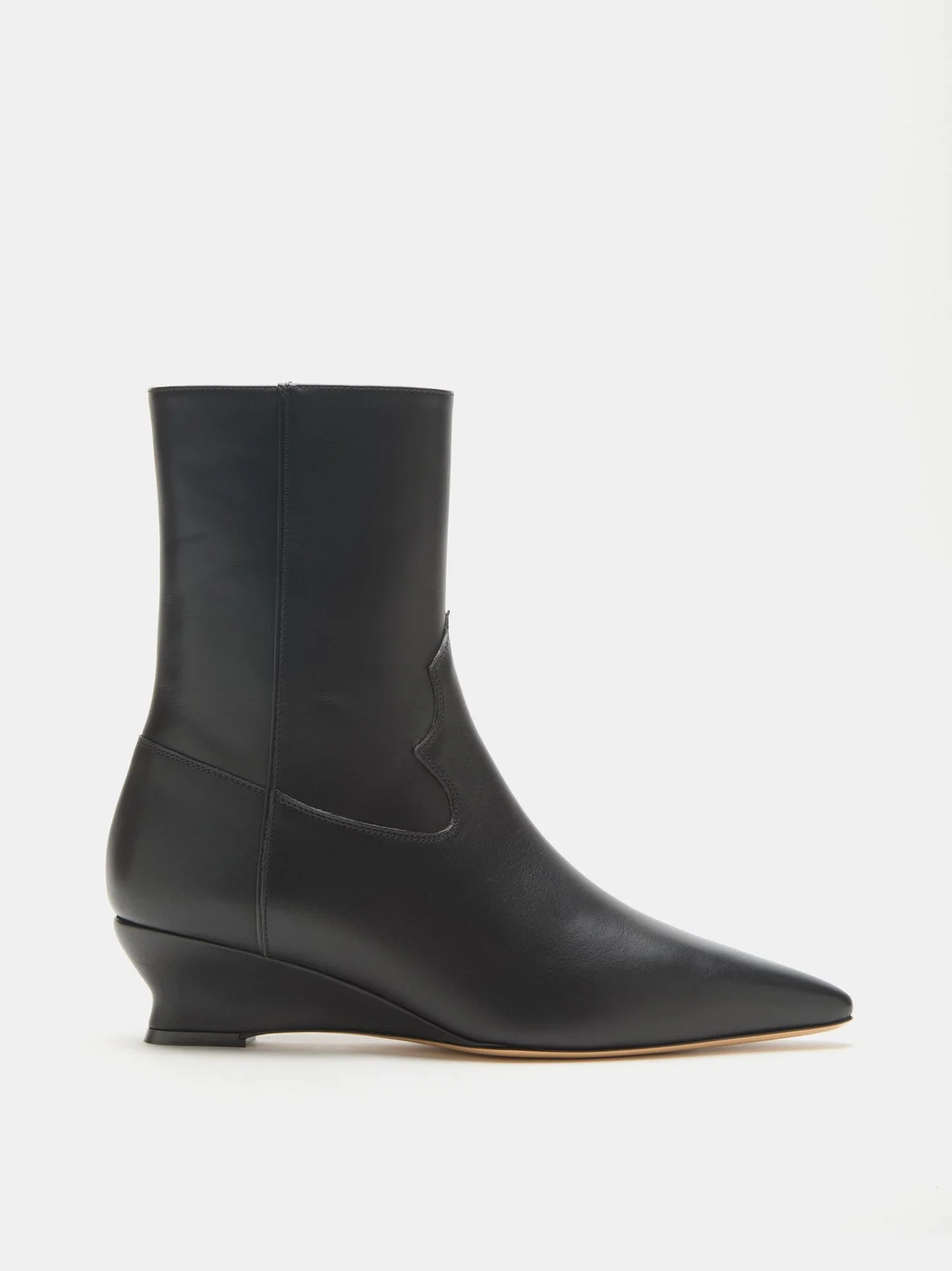Camille Boot, handcrafted in black leather, with a pointy toe and cushioned calf leather insole. 40mm heel. Made in Italy.
