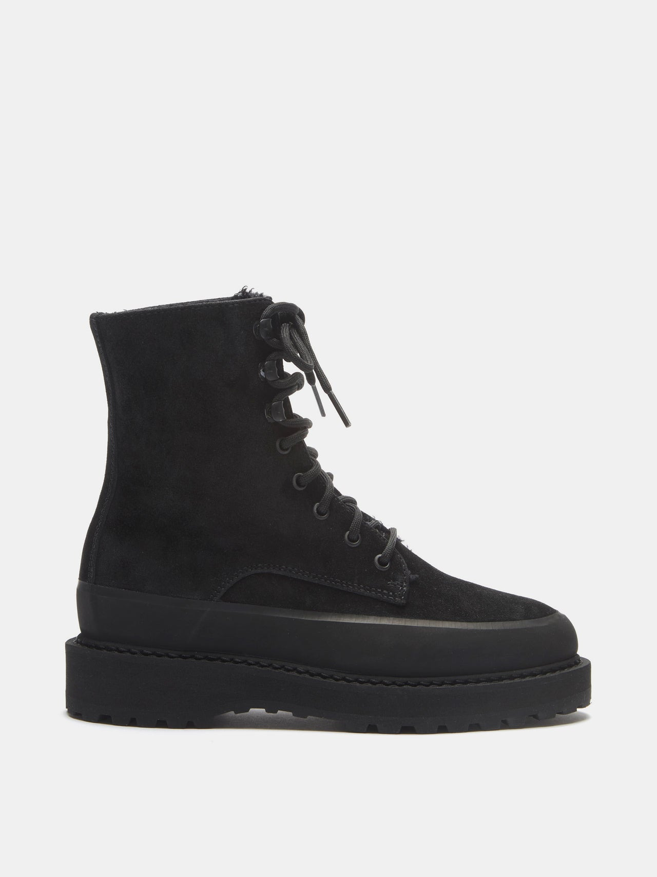 Dolomite Boot, handcrafted in black suede with a cushioned shearling lining, tread in smooth, anti slip rubber with a 25mm heel. Made in Italy. This style fits large, we recommend trying a full size down. Dolomite Boot, handcrafted in black suede with a cushioned shearling lining, tread in smooth, anti slip rubber with a 25mm heel. Made in Italy. This style fits large, we recommend trying a full size down.