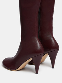 Le Monde Beryl x Kim Sion Madison Boot, handcrafted in burgundy nappa leather with side zipper closure, a cushioned calf leather insole and a triangular 95mm heel. Made in Italy. An exclusive capsule created in collaboration with Le Monde Beryl and creative consultant Kim Sion. Orders will be shipping in snakeskin print packaging with a black PVC dust bag. Le Monde Beryl x Kim Sion Madison Boot, handcrafted in burgundy nappa leather with side zipper closure, a cushioned calf leather insole and a triangular 95mm heel. Made in Italy. An exclusive capsule created in collaboration with Le Monde Beryl and creative consultant Kim Sion. Orders will be shipping in snakeskin print packaging with a black PVC dust bag.
