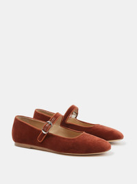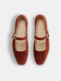 Mary Jane, handcrafted in brick velvet with a new soft construction, buckle-fastening, a cushioned calf leather insole and grosgrain piping. 13mm heel. Made in Italy.