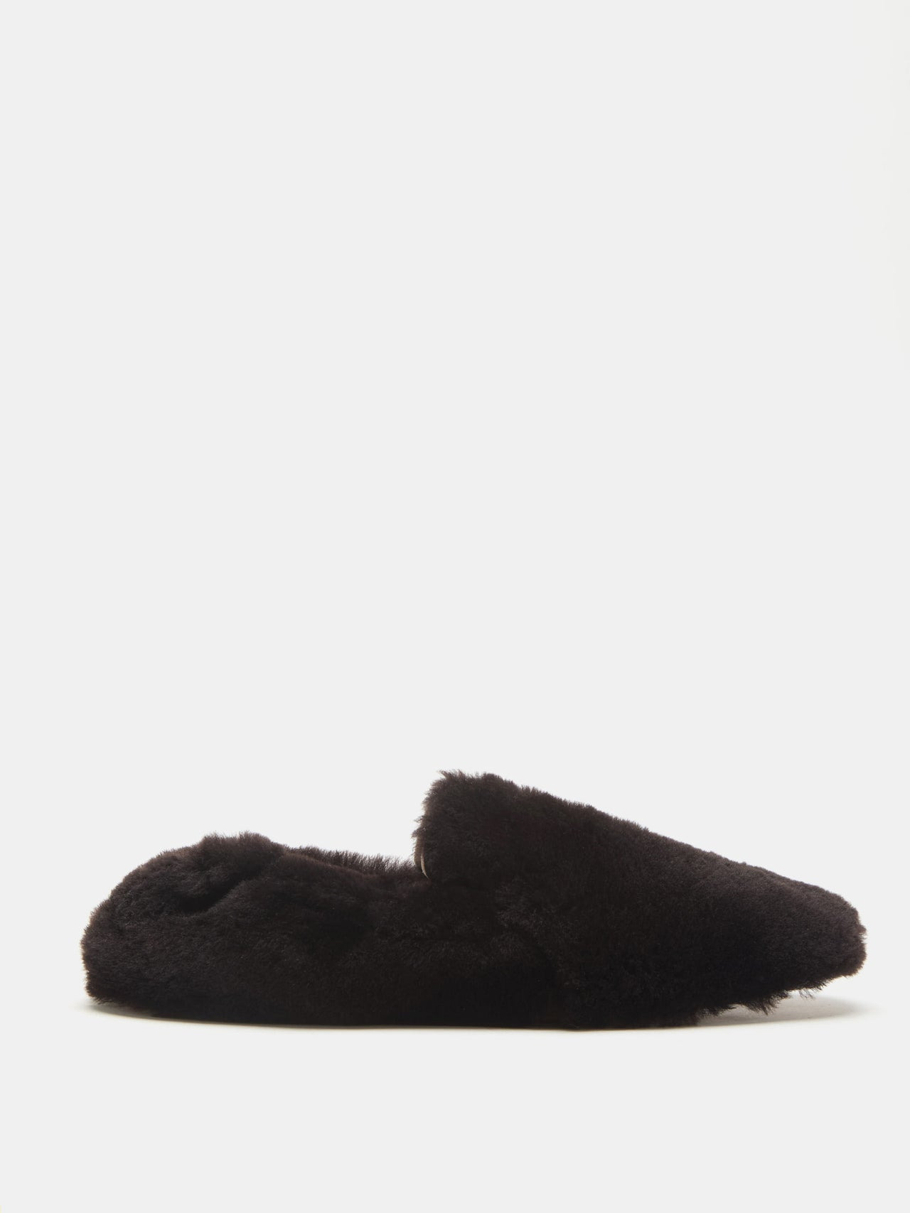 Orlando Moccasin, handcrafted in chocolate shearling with a cushioned calf leather insole and elasticated back. 8mm heel. Made in Italy.