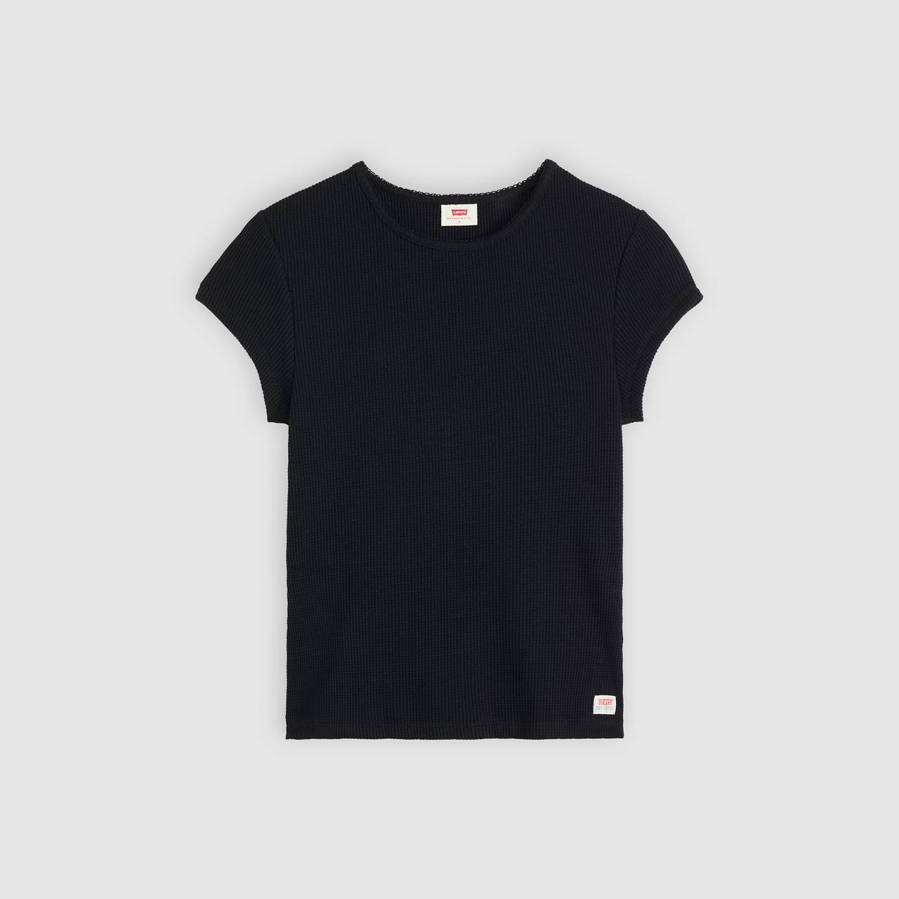 Inspired by one of the first knitwear pieces we made in the early 1900s, Levi's® Dry Goods was resurrected in the late '90s—and now, it's back again. This Cap-Sleeve Tee is as comfortable as it is practical thanks to its waffle-knit design, cap sleeves and figure-hugging slim fit. - Part of Levi's® Dry Goods: a collection of all the pieces we loved in the ‘90s, made for today - A waffle-knit tee - Cut with a slim fit - Finished with delicate lace trim around the sleeves and neckline Style # 003PW0001 Color: Anthracite Night - Black How it Fits - Slim fit Composition & Care - 95% Cotton, 5% Elastane - Crewneck - Capped sleeves - Imported