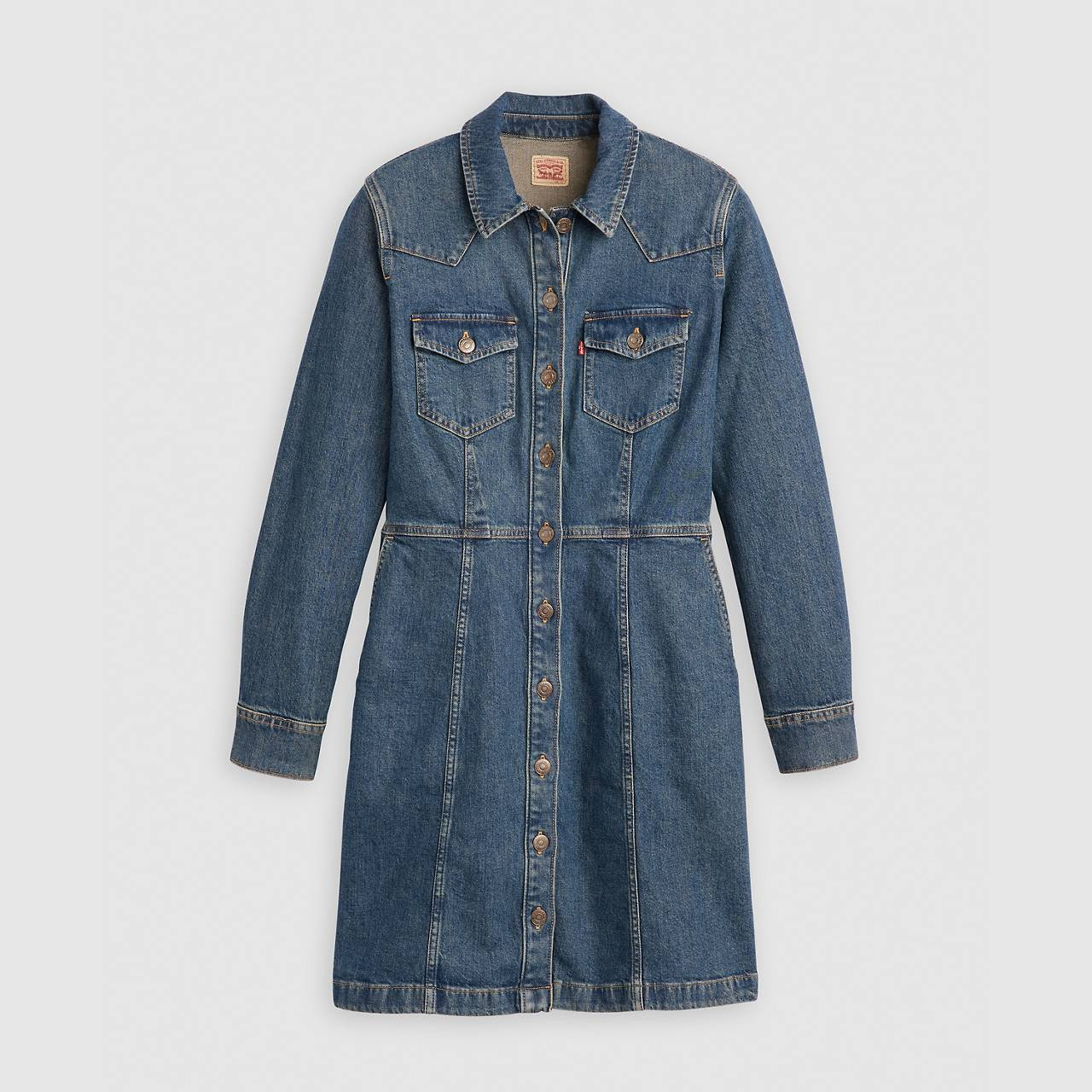 An A-line take on the classic Levi's® shirt, our Flynn Western Dress gives denim a major upgrade. We designed it with classic Levi's® details like double front pockets, a pointed collar and buttons down the front. - An A-line take on a classic Levi's® western shirt - With a button-up front - Made from soft denim Style # A75920006 Color: There We Go - Dark Wash How it Fits - Standard fit Composition & Care - 79% Cotton, 20% Recycled Cotton, 1% Elastane - Cotton - Long sleeves - Imported