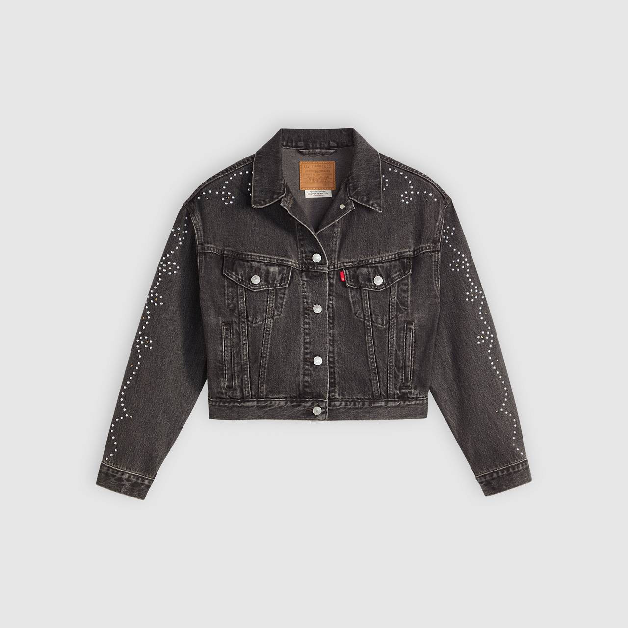 Our iconic '90s Trucker Jacket gets a cropped update. You'd be hard-pressed to find a jacket with an easier shape, more versatile weight or inherent sense of cool. Bonus: This throwback cut features a pitched silhouette for a distinctly ‘90s feel and a studded design. - An homage to our iconic Trucker Jacket - Cut with a cropped, relaxed fit - Constructed with a unique pitched '90s profile and two-flap pocket design - Finished with a studded design - Gets better over time with natural wear Style # A94560003 Color: Bejeweled - Black How it Fits - Relaxed fit Composition & Care - 100% Cotton - Denim - Non-Stretch - Long sleeves - Imported