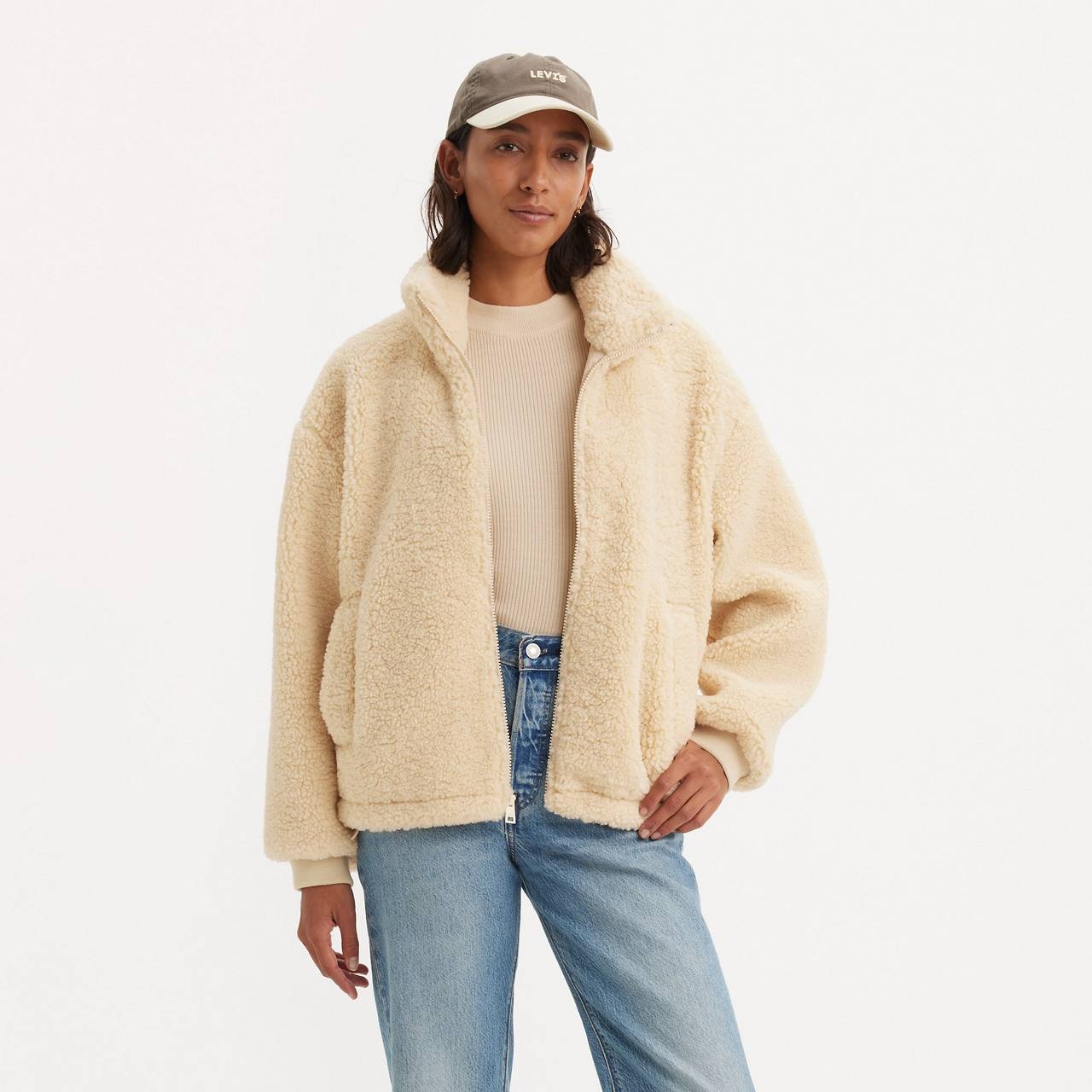 All over plush Sherpa outer shell. Soft, rib knit cuffs for comfort. Stand collar adds additional protection against cold weather. Center front zipper closure. Hidden, adjustable drawcord at waist offers a custom fit. Dual lower welt pockets with hidden snap closure. Signature Levi's red tab at lower left seam. Style # 595460026 Color: Creme Brulee - Tan Composition & Care - FAUX FUR SHELL: 100% Polyester WOVEN SHELL: 100% Polyester LINING: 100% Polyester KNIT: 99% Polyester 1% Spandex - Machine wash cold with like colors, delicate cycle, tumble dry low - Imported