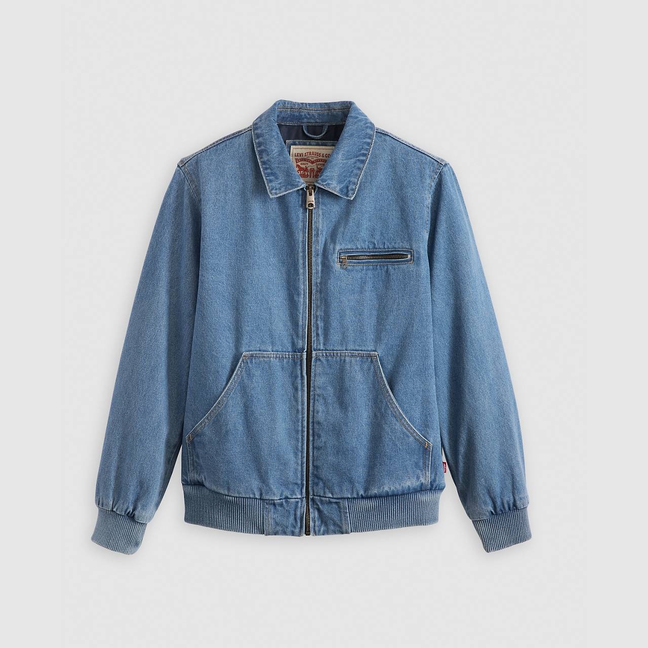Two lower pockets and one chest zipper pocket Levis Red Tab at lower left side seam Zipper Long sleeves Made in China - Machine wash cold with like colors, Delicate cycle, Use only non-chlorine bleach when needed, Tumble dry low, Cool iron if needed Style # 594850001 Color: Z9999 Cny Black Gold - Black How it Fits - Experience effortless style and comfort with this western bomber - featuring a sleek laydown collar and distinctive western arcuate yoke detail. This jacket’s perfect balance of rugged sophistication and soft cotton embrace will make it your new favorite companion for every adventure. - Laydown collar - Center front zipper closure - Rib knit cuffs and hem Composition & Care - 100% Cotton - Cotton - Standard fit