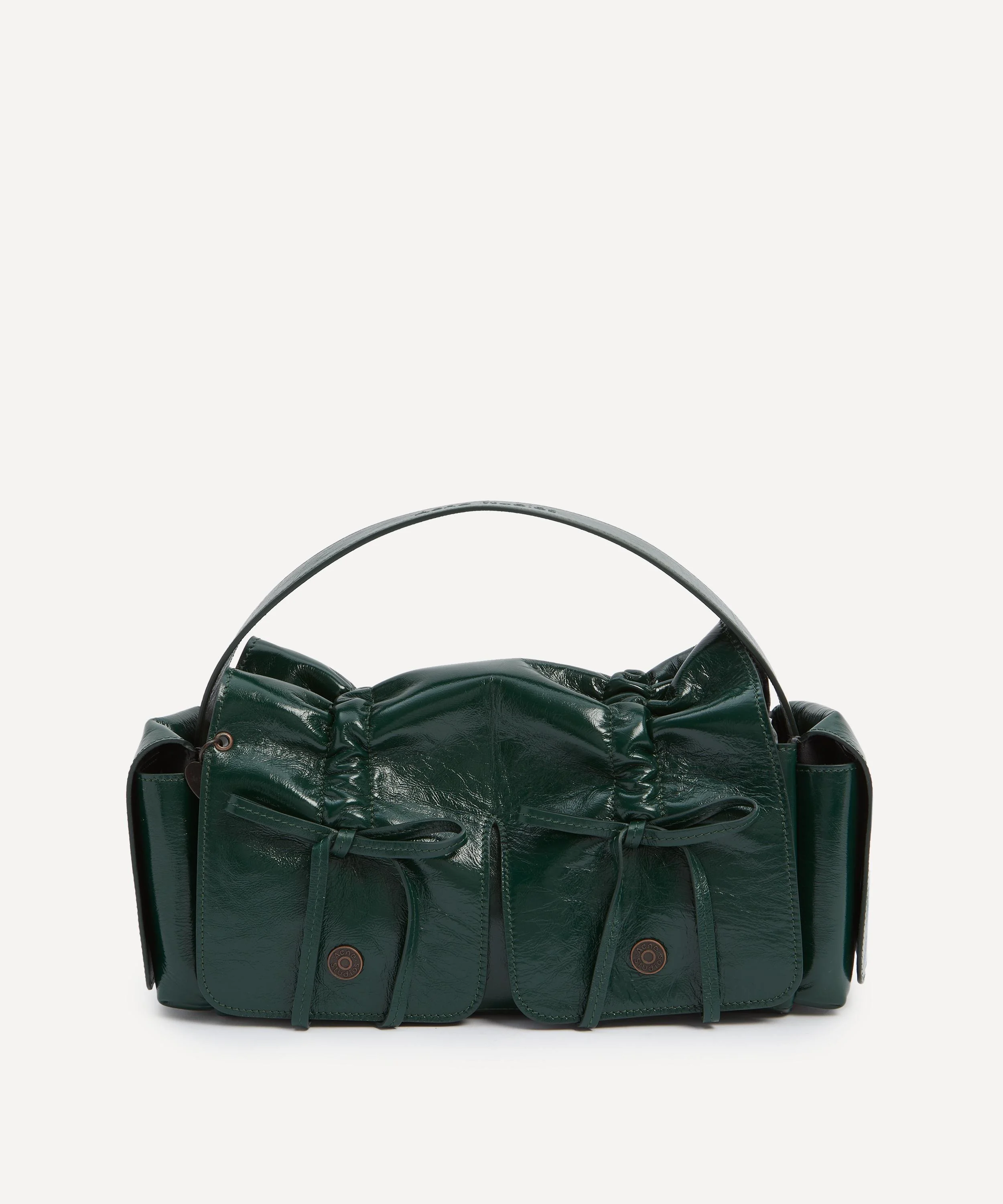 DETAILS Shoulder bag Laminated crinkled leather Laced knot details Flap pocket with magnetic closure Adjustable strap Made in Italy COMPOSITION & SIZE Outer: 100% Leather Lining: 50% Polyurethane; 50% Polyester H: 13cm, W: 33cm, D: 11cm Strap L: 45cm-75cm