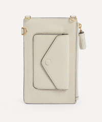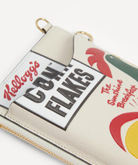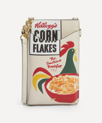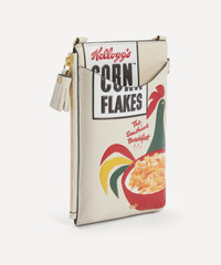 DETAILS Anya Brands Corn Flakes Zip Phone Pouch on Strap Tassel zip pull with pocket Phone slip compartments Anya Hindmarch branding Snap closure compartment Adjustable strap Kelloggs® logo COMPOSITION & SIZE Leather H: 16.5cm, W: 10cm, D: 2cm