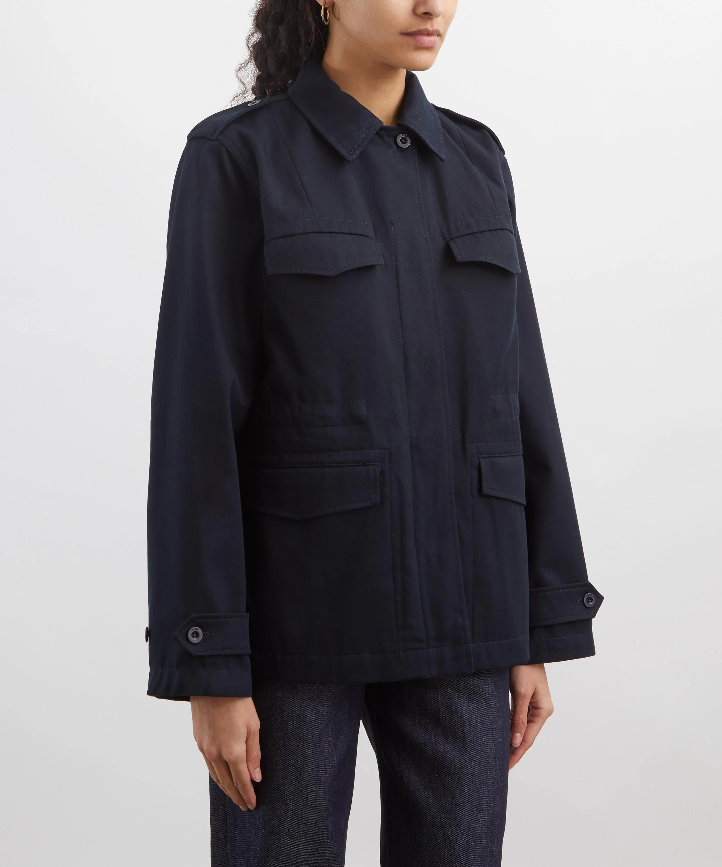 DETAILS Cotton gabardine safari jacket Straight cut Fitted at waist Point collar Buttoned epaulettes Concealed button fastening Four front flap pockets SIZE & FIT Model is 175cm/5’9" Chest: 82cm; Waist: 59.5cm; Hip: 86cm and wears a size 36 COMPOSITION & CARE 100% Cotton Machine wash cold 30°C, inside-out