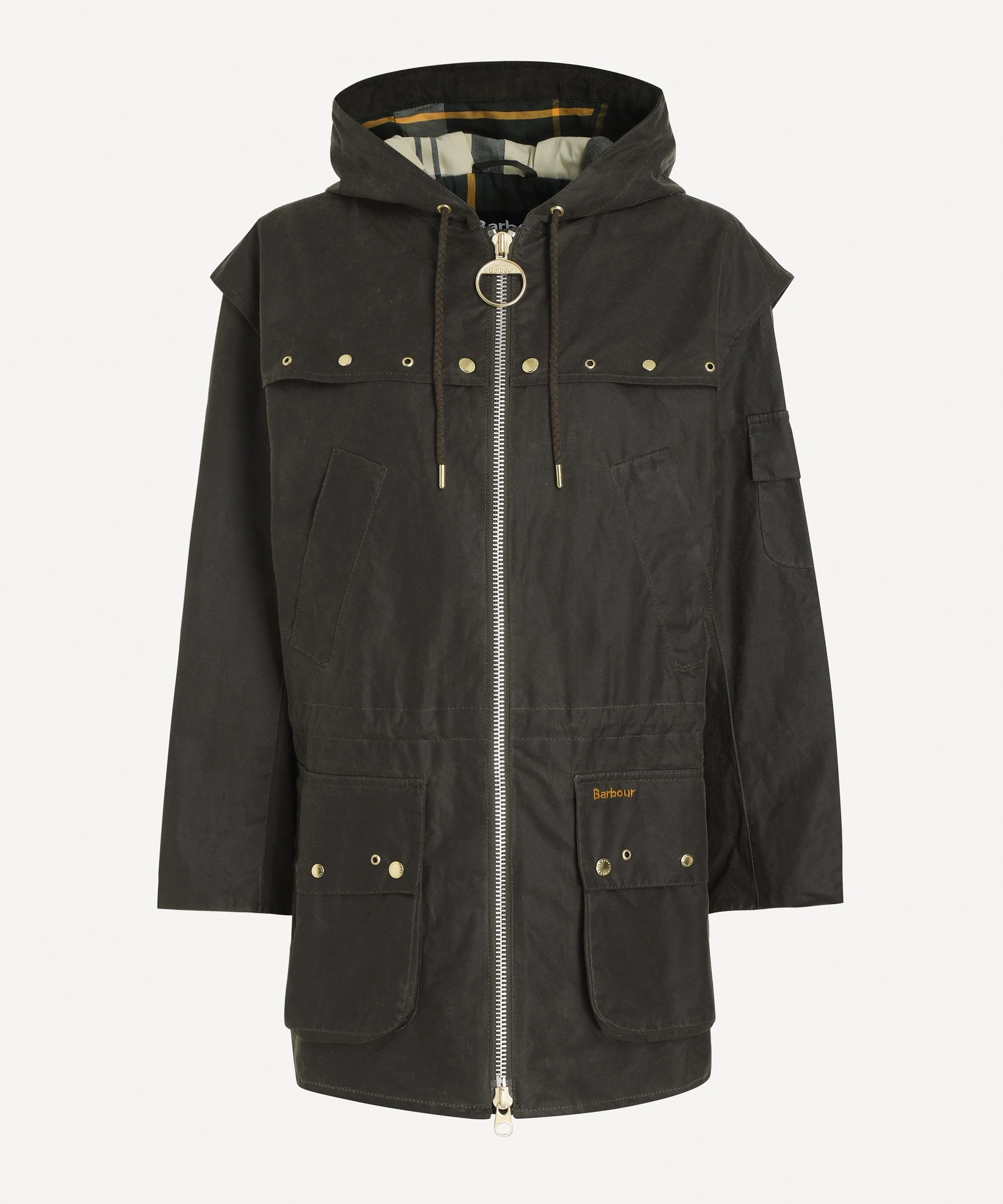 DETAILS Waxed cotton jacket Fixed drawstring hood Front and back yokes Silver zip fastening Metal D-ring Handwarmer pockets Front bellow pockets Branding to left pocket Tartan lining SIZE & FIT Model is 176cm/5'9.5"; Chest: 81cm; Waist: 62.5cm; Hip: 89cm and wears a size 8 COMPOSITION & CARE Outer: 100% Cotton Lining: 65% Polyester; 35% Cotton Do not wash. Sponge clean only