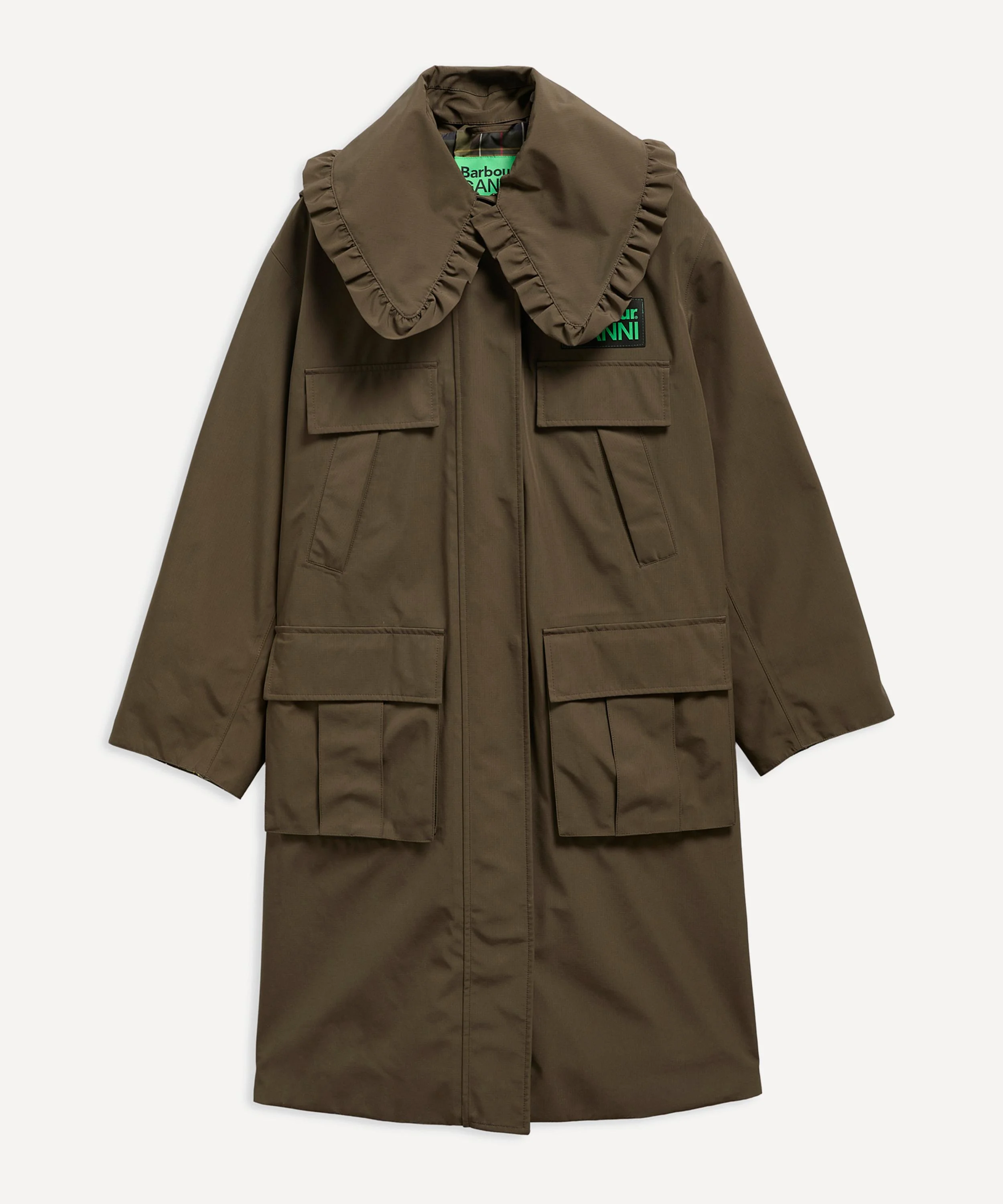 DETAILS Waterproof Parka Jacket Barbour x GANNI collaboration Detachable tonal frill collar Tartan elbow patches Stud-off hood Snap closure with concealed zipper Dual-branded ring pull Chest welt pockets with flaps Bellow pockets Rear pleat Barbour x GANNI co-branded silicone patch Tartan lining COMPOSITION & CARE 100% Polyester Machine washable