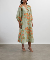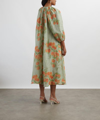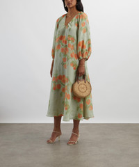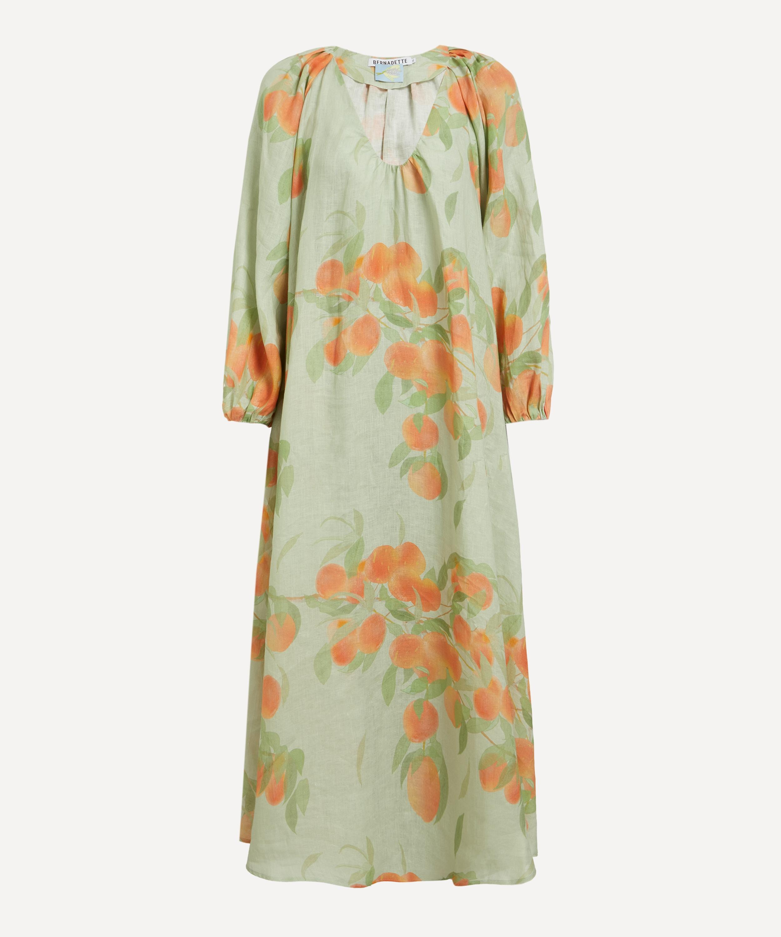DETAILS Linen maxi dress Relaxed fit Gathered shoulders cuffs Long puffed sleeves Deep V-neckline Peach Tree print SIZE & FIT Model is 179cm/5'10.5"; Chest: 81cm; Waist: 64cm; Hip: 89cm and wears a size 8 COMPOSITION & CARE 100% Linen Dry clean