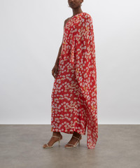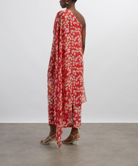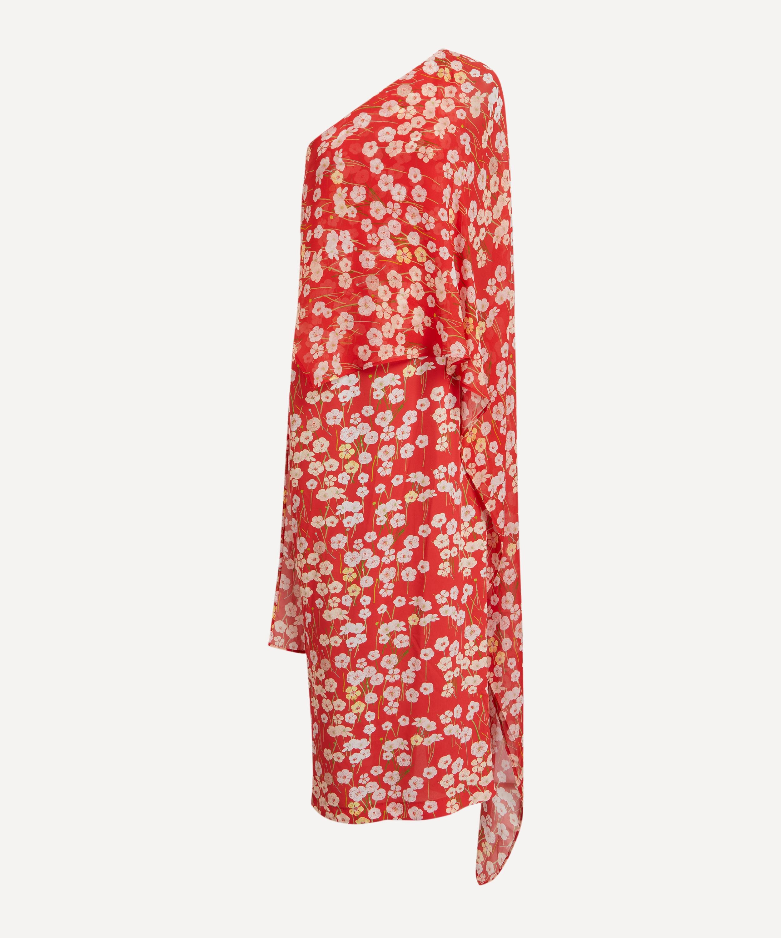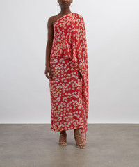 DETAILS Crepe dress Loose fit Maxi length Off-the-shoulder design Single cape sleeve Red Buttercups print SIZE & FIT Model is 175cm/5'9"; Chest 30cm; Waist: 61cm; Hip: 89.5cm and wears a size 8 COMPOSITION & CARE 100% Viscose Dry clean