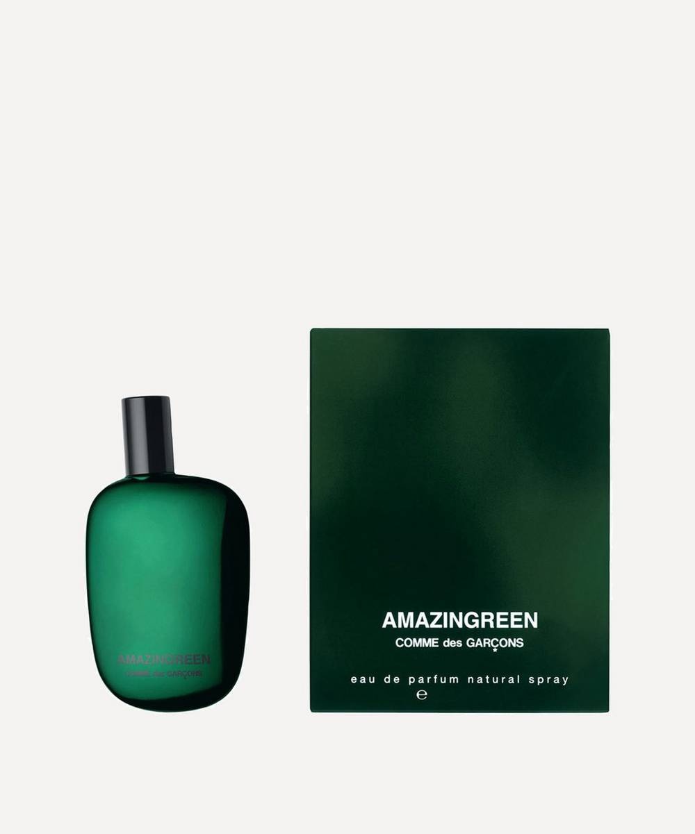 Editor's Notes Amazing Green Eau de Parfum 100ml from the Comme des Garçons collection. Energizing fragrance that fuses the freshness of natural wild leaves with smoky notes of gunpowder and white musk. The green energy of the jungle will enliven you every morning every time this verdant perfume graces the skin. Features 100ml Top notes: Palm tree leaves, green pepper, dew mist and jungle leaves Heart notes: Ivy leaves, orris roots, coriander seeds and silex Base notes: Gunpowder accord, vetiver, smoke and white musk Housed in a green glass bottle HOW TO USE Apply as desired, to pulse points behind your ear, at the bottom of your throat, on your wrist, inside your elbow and behind your knee.