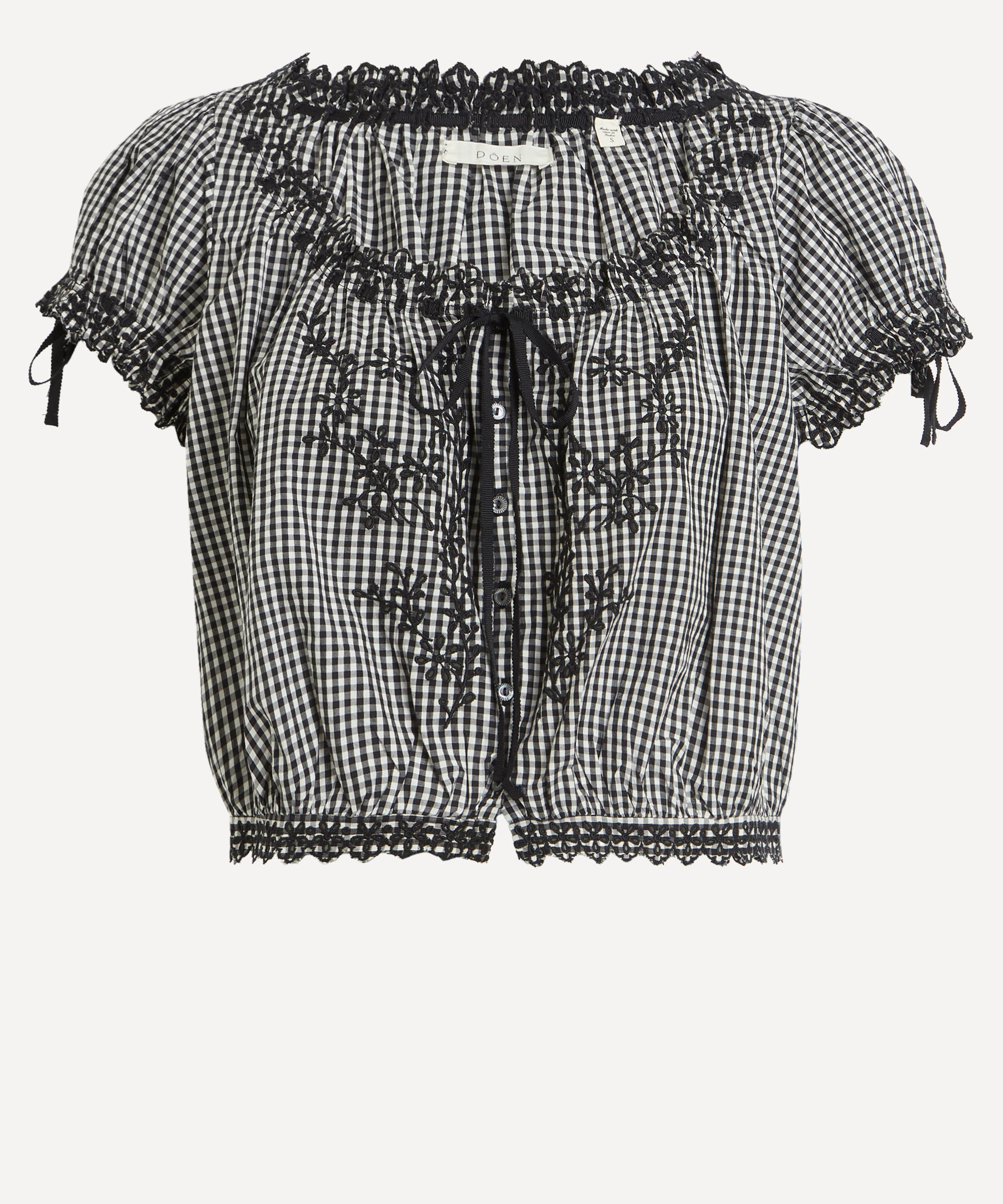 DETAILS Gingham cotton poplin top Short puff sleeves Slightly cropped silhouette Scoop neckline with threaded grosgrain ribbon Button fastening Front floral eyelet embroidery SIZE & FIT Model is 178cm/5'10"; Chest: 79cm; Waist: 62cm; Hip: 88cm and wears S COMPOSITION & CARE 100% Cotton Hand wash cold. Do not bleach. Lay flat to dry. Low iron