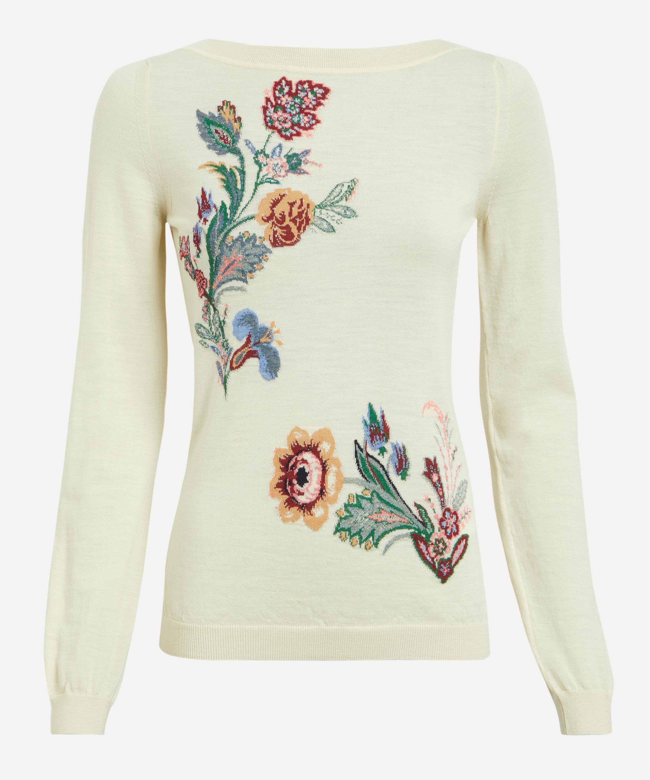 DETAILS Wool-blend jacquard jumper Fitted Long sleeves Round neckline Ribbed edging Inlaid floral jacquard motifs Made in Italy SIZE & FIT Model is 178cm/5'10"; Chest: 77cm; Waist: 65cm; Hip: 92cm and wears a size 8 COMPOSITION & CARE 82% Wool; 11% Polyamide; 5% Viscose; 1% Polyester; 1% Cotton Dry clean