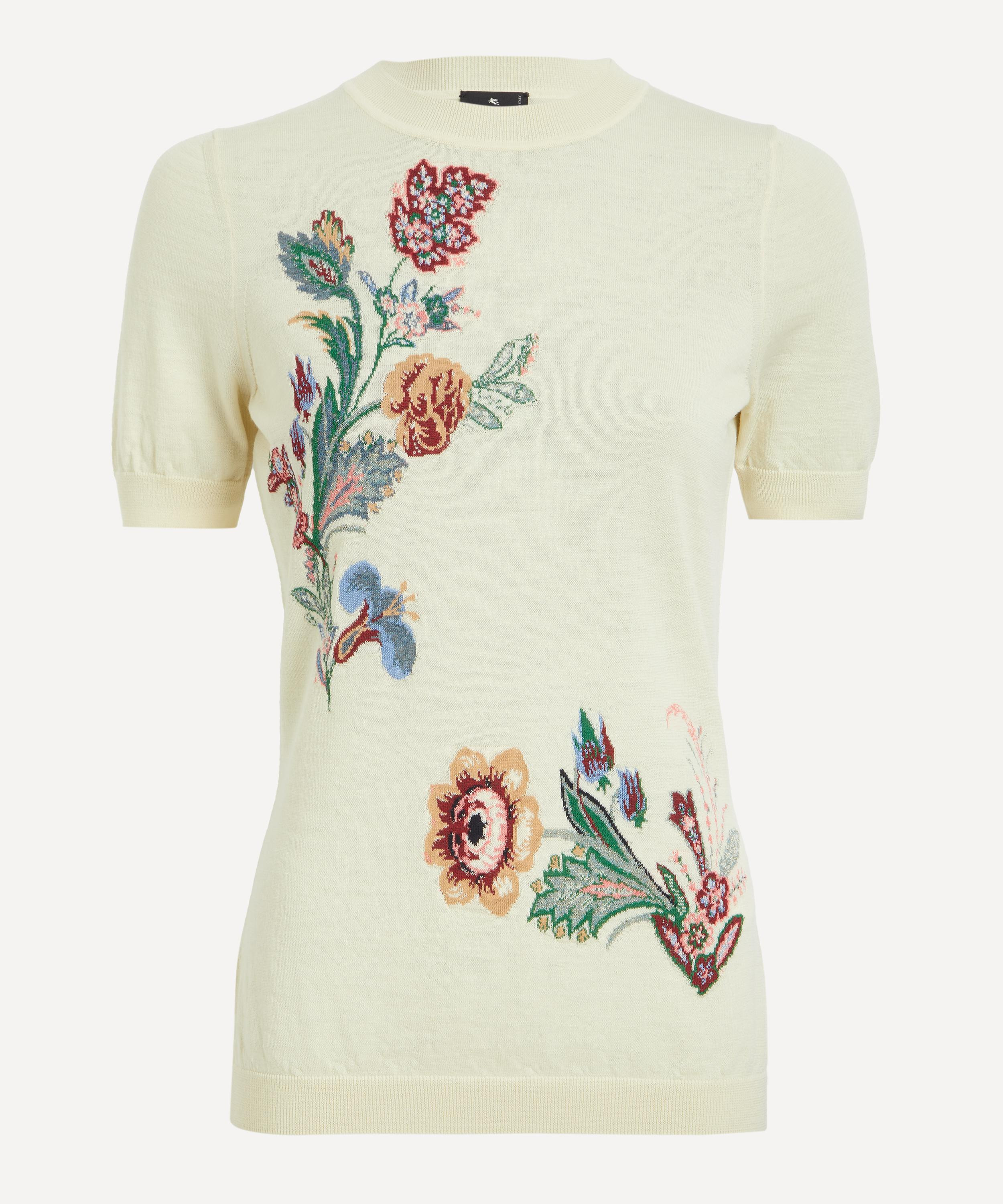 DETAILS Wool-blend jacquard jumper Fitted Short sleeves Round neckline Ribbed edging Inlaid floral jacquard motifs Made in Italy SIZE & FIT Model is 178cm/5'10"; Chest: 77cm; Waist: 65cm; Hip: 92cm and wears a size 8 COMPOSITION & CARE 82% Wool; 11% Polyamide; 5% Viscose; 1% Polyester; 1% Cotton Dry clean