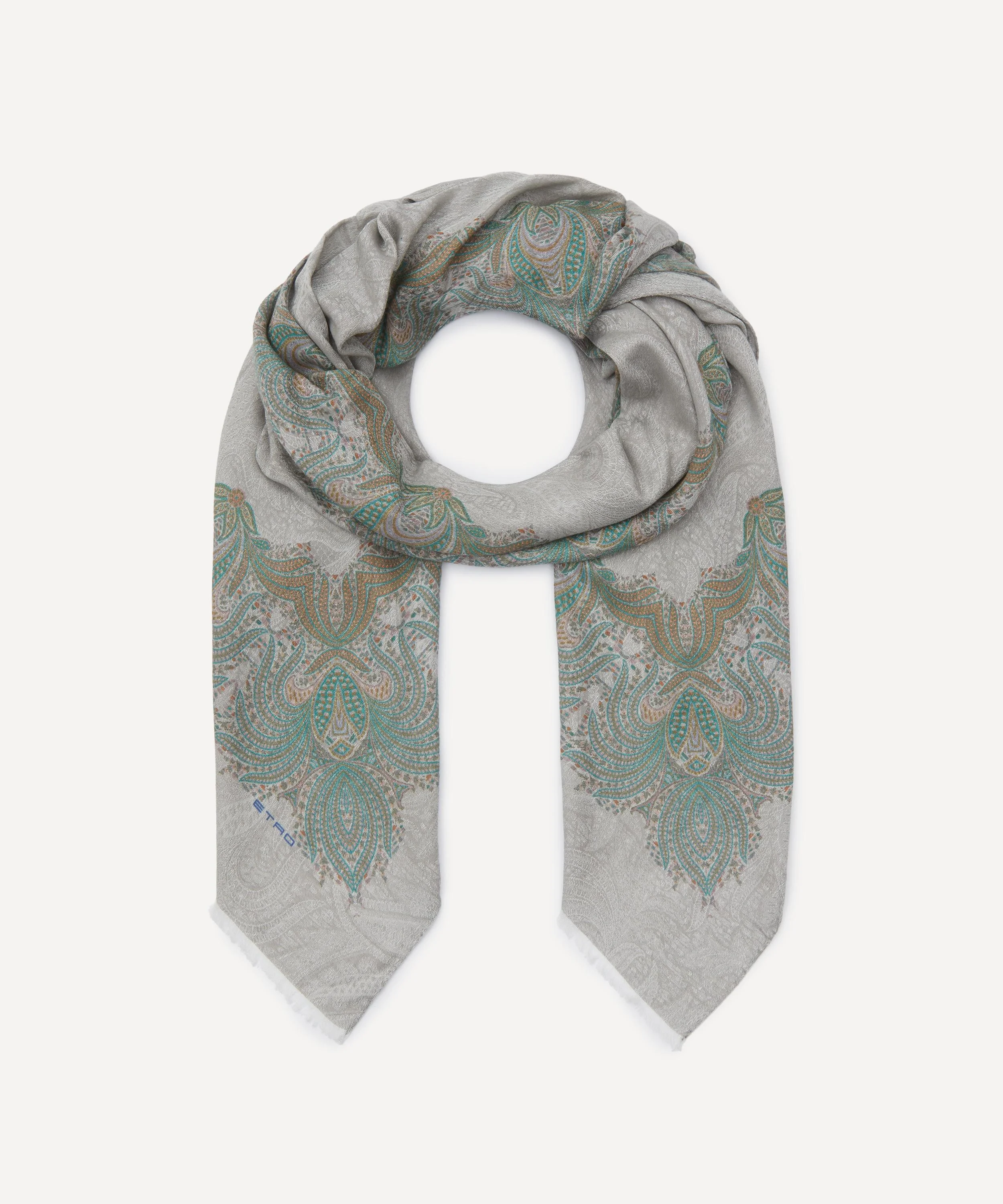 DETAILS Scarf Cotton and modal blend Contrasting foliage jacquard pattern Slightly frayed edges ETRO logo at the corner Made in Italy COMPOSITION & SIZE 53% Cotton; 47% Modal L: 200cm, W: 70cm