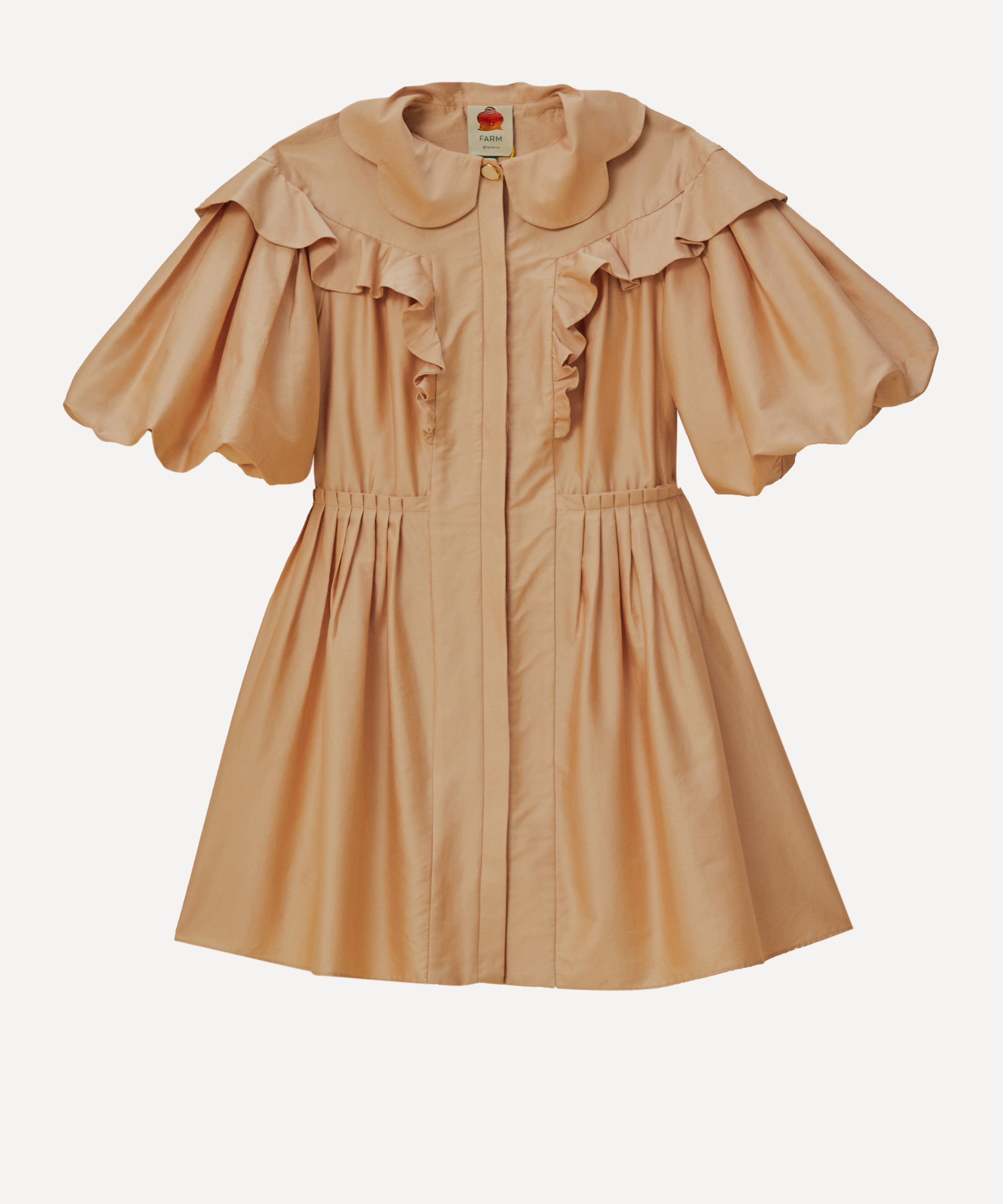 DETAILS Cotton-blend mini-dress A-line silhouette Short puff-sleeves Scalloped Peter Pan collar Frilled yoke Exposed gold top button Concealed button closure Adjustable buckle-belt Pleated waist COMPOSITION & CARE 97% Cotton; 3% Elastane Gentle machine wash