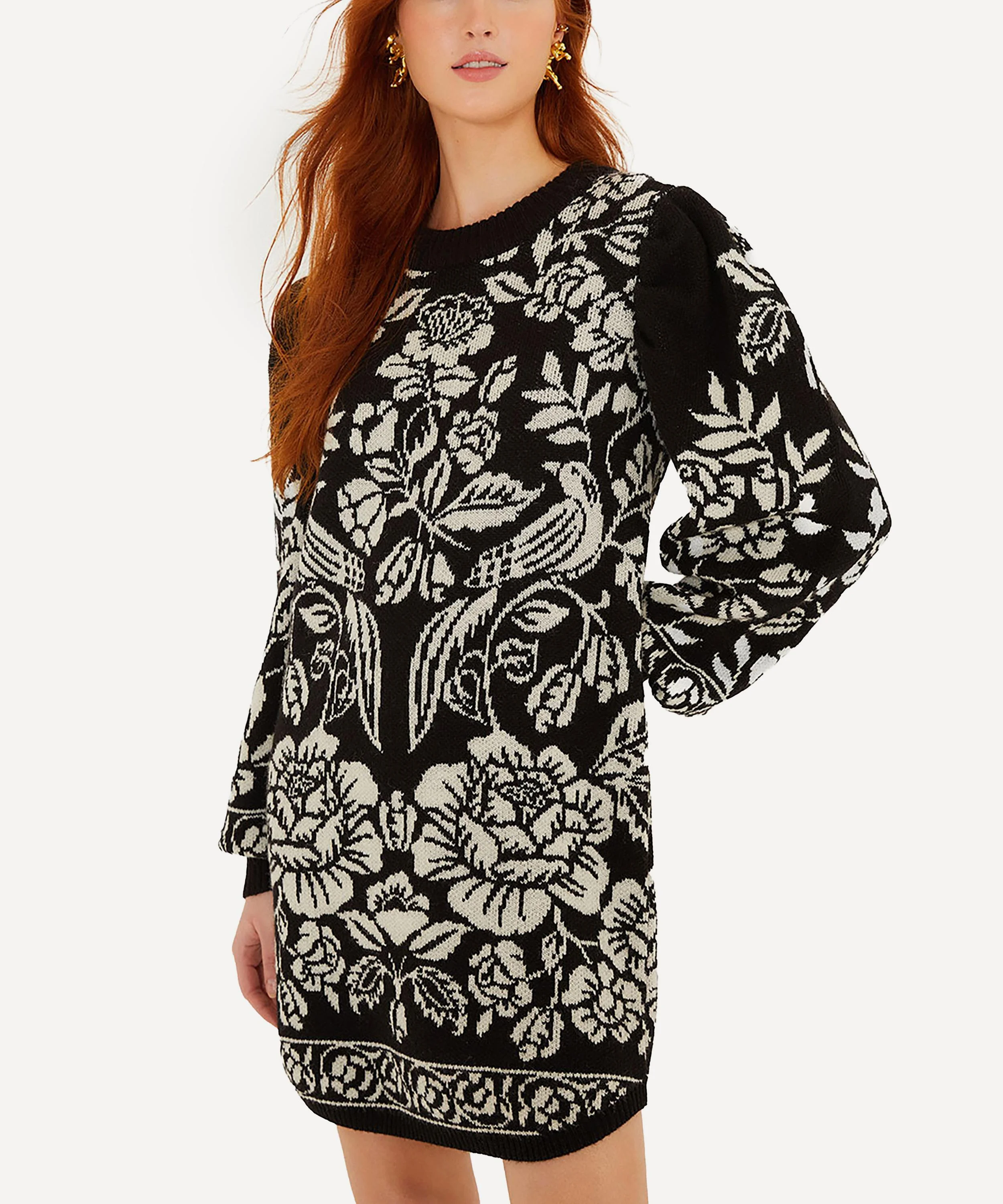 DETAILS Knitted mini dress Easy fit Long sleeves Round neckline Ribbed trims Black and White Cashew and Birds jacquard print COMPOSITION & CARE 55% Acrylic; 35% Polyamide; 10% Wool Hand wash