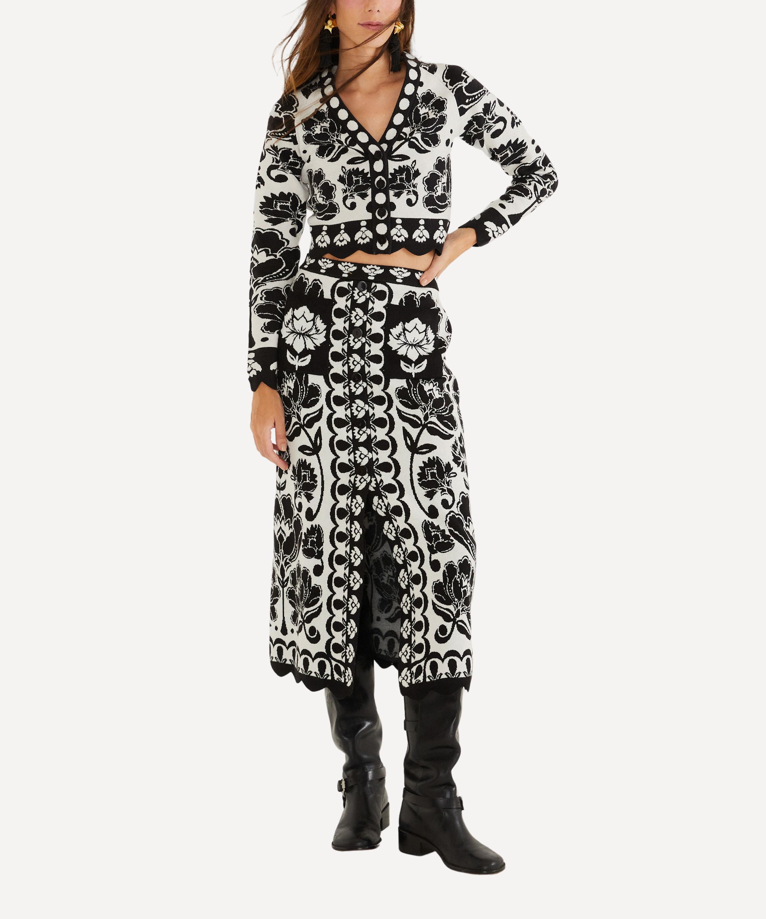 DETAILS Knitted top Regular fit Slightly cropped length V-neckline Front button fastening Scalloped hem Black and white floral jacquard pattern COMPOSITION & CARE 30% Polyester; 24% Viscose; 24% Polyamide; 22% Acrylic Hand wash