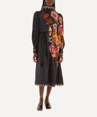 DETAILS Viscose midi dress High neckline Long blouson sleeves Buttoned cuffs Braided waist tie Scallop-edged trims Back keyhole opening with button Black Chenille Flowers print COMPOSITION & CARE 54% Viscose; 46% Rayon Hand wash