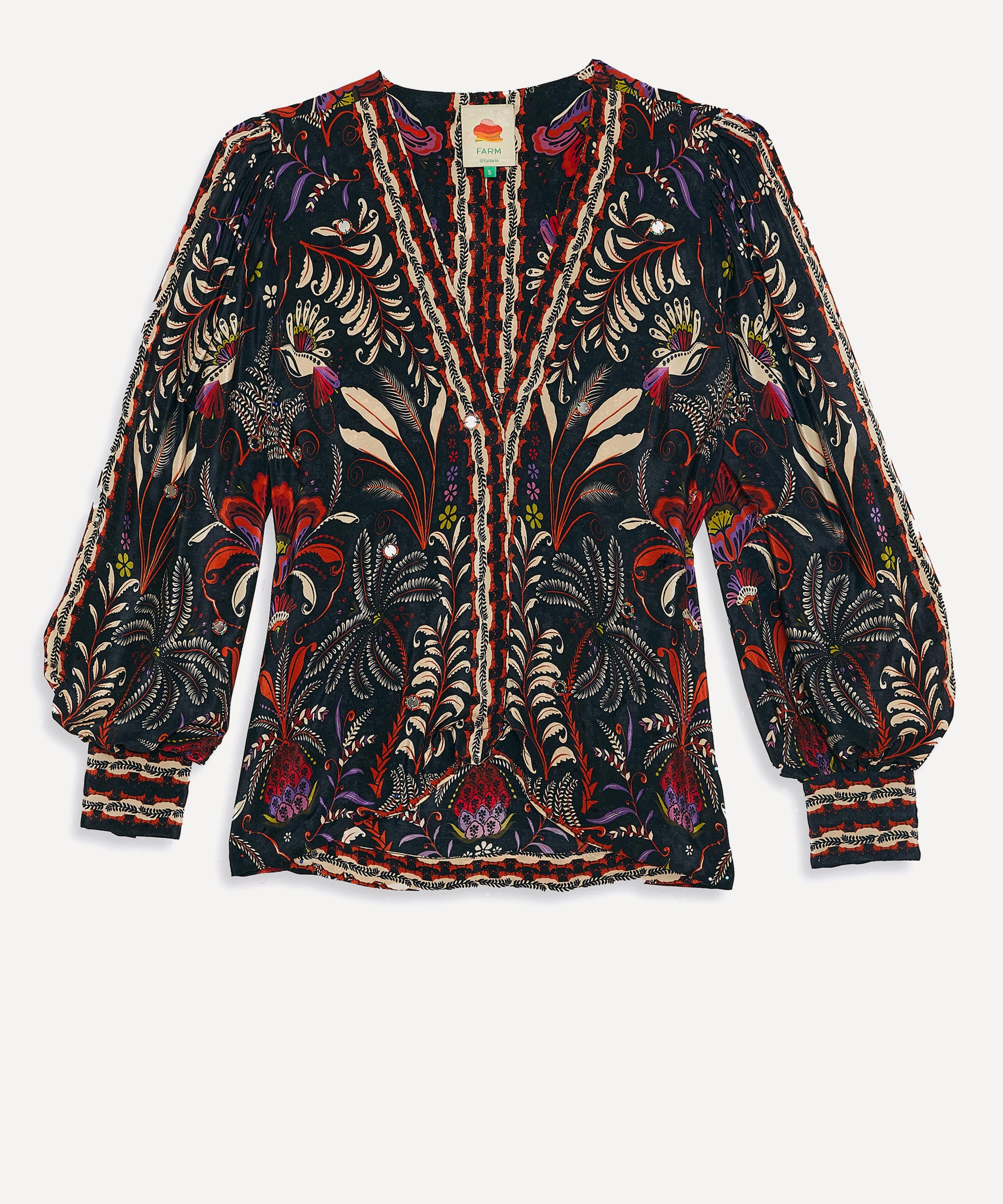 DETAILS Blouse Easy fit Plunging surplice neckline Centre front button placket Long bouffant sleeves Fitted cuffs Beaded mirror appliques Black Classic Garden print COMPOSITION & CARE 100% Viscose Delicate machine wash