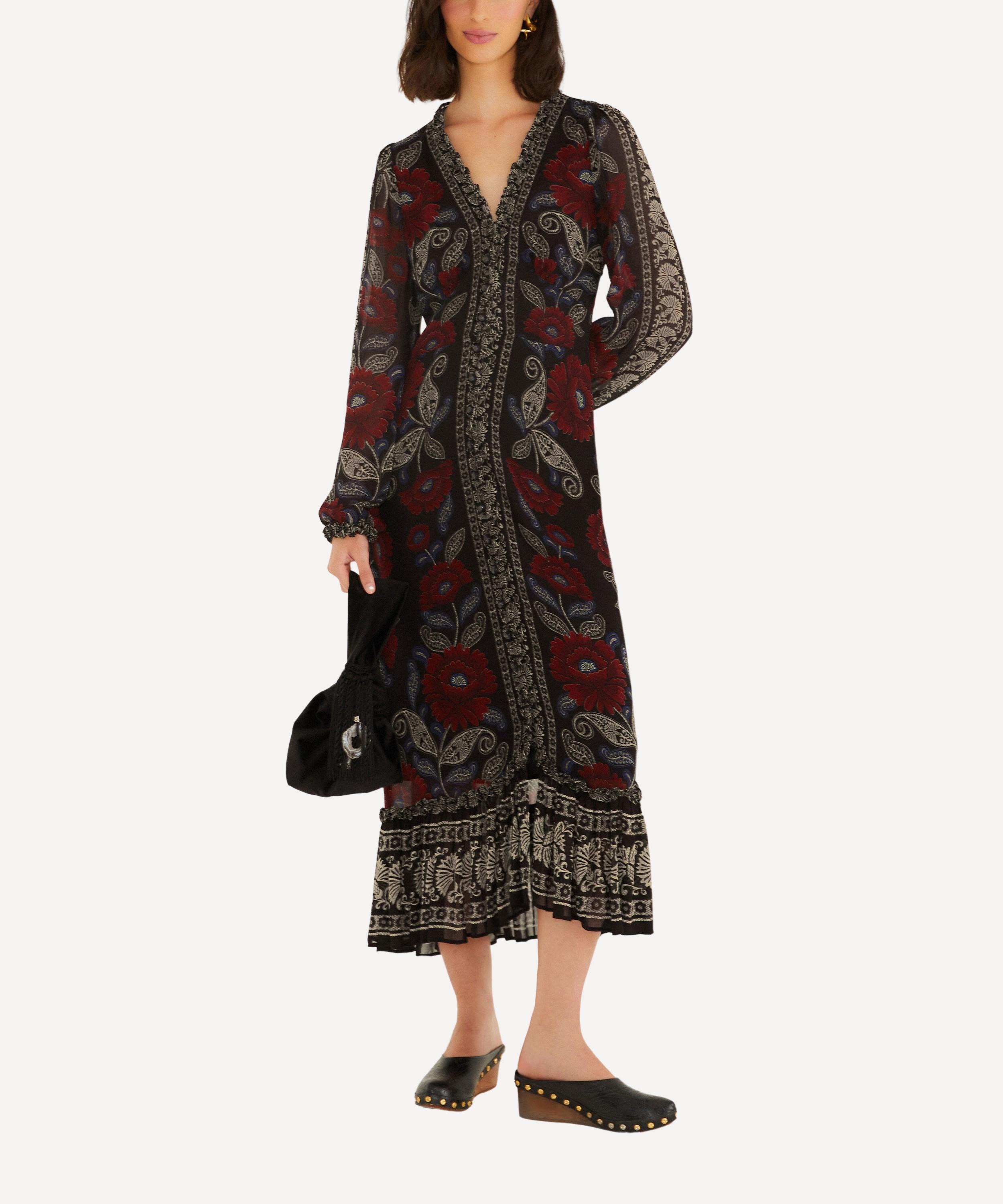DETAILS Midi dress Regular fit Long puff sleeves Ruffled V-neckline Front button fastening Frilled paisley hem Floral paisley print COMPOSITION & CARE 100% Viscose Dry clean