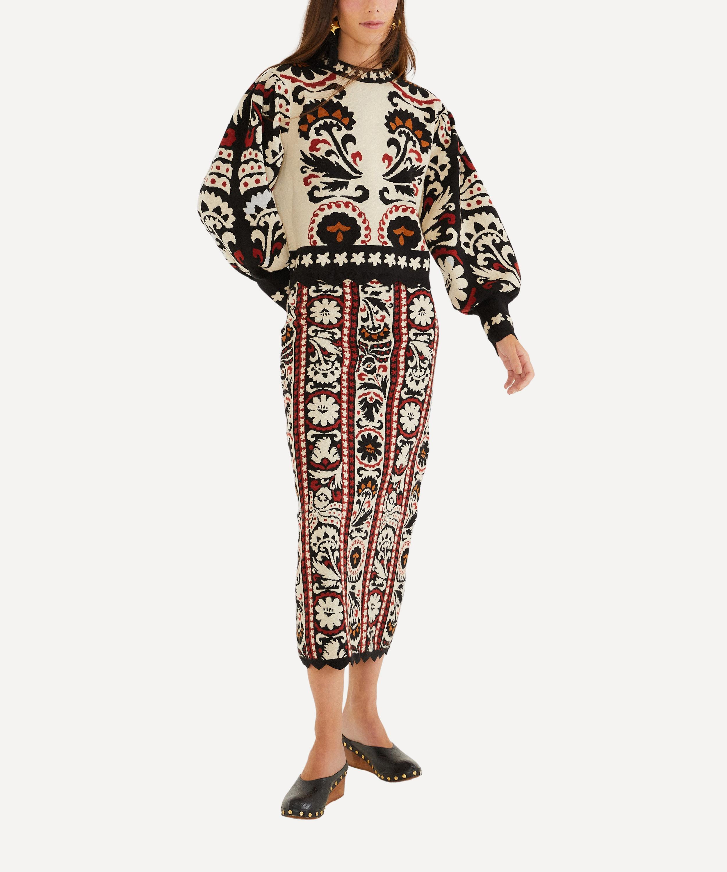 DETAILS Knitted jumper Relaxed fit Dropped shoulders Long balloon sleeves Round neckline Ribbed trims Tapestry print COMPOSITION & CARE 55% Acrylic; 35% Polyamide; 10% Wool Hand wash