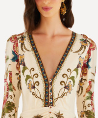 DETAILS Viscose midi dress V-neckline Partial button placket Gathered drop waist Long sleeves Gathered midi skirt Zipper at centre-back Cream Majestic Hearts print COMPOSITION & CARE 100% Viscose Hand wash