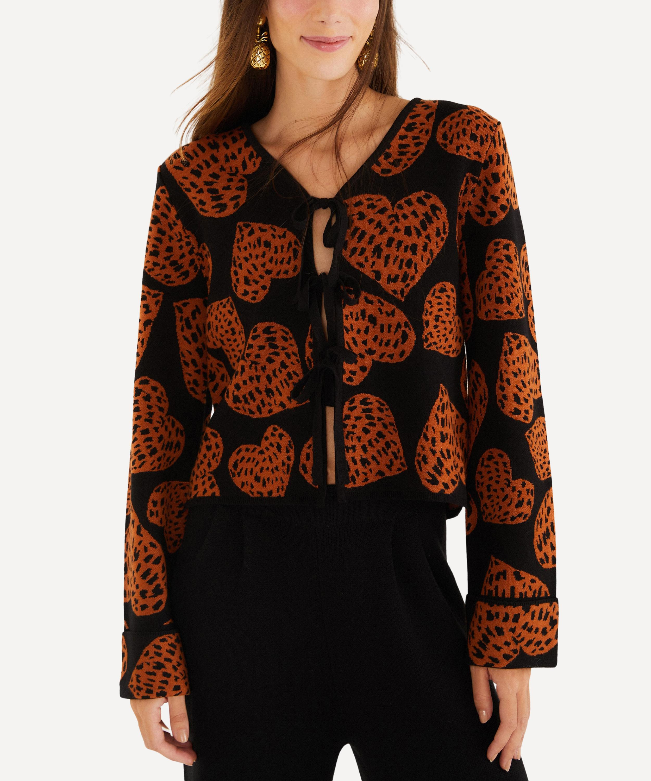 DETAILS Knitted cardigan Regular fit Long sleeves V-neck Tie-front closure Leopard Hearts motif COMPOSITION & CARE 65% Viscose; 35% Polyamide Hand wash